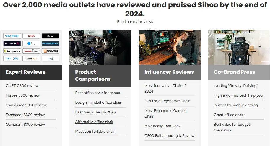 西昊在海外 PR 端,不是单纯追求泛曝光,而是优先进入办公、科技、家居评测类权威媒体的话语体系。其官方媒体背书页明确展示了来自 CNET、Forbes、Tom’s Guide 等媒体的评测与引用,并称截至 2024 年底,已有 2,000+ 媒体渠道对品牌进行过评测或报道。