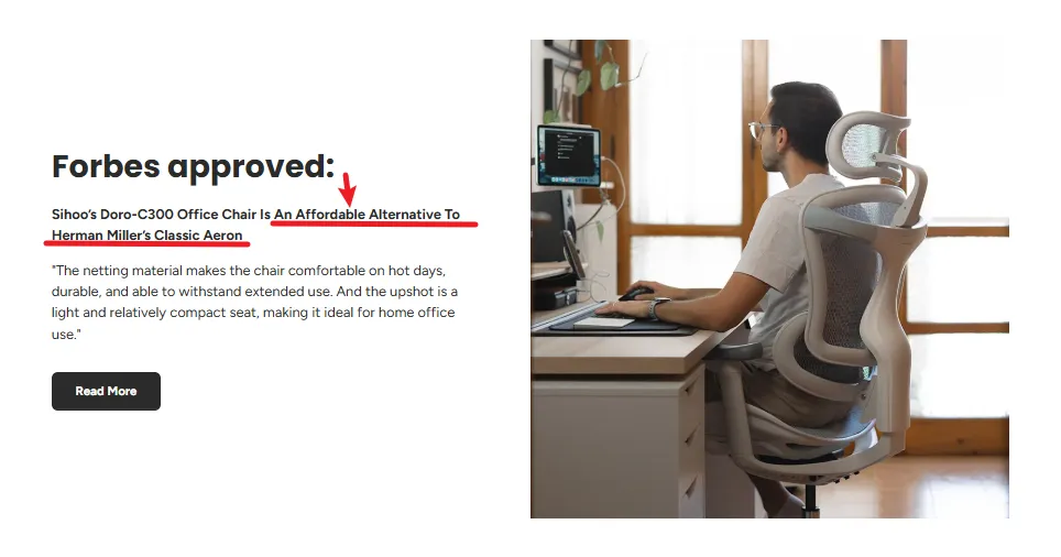 Forbes(福布斯,美国)不只是“报道了产品”,而是帮助品牌建立了高端参照系。Forbes 文章标题直接将 Doro-C300 定义为 “Herman Miller 经典 Aeron 的更平价替代品”,这类表述本质上是在用全球经典办公椅作为锚点,帮助西昊快速跨越用户对中国品牌的认知门槛。