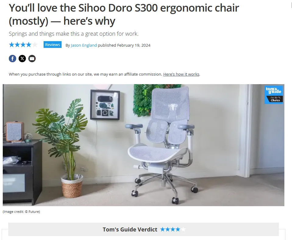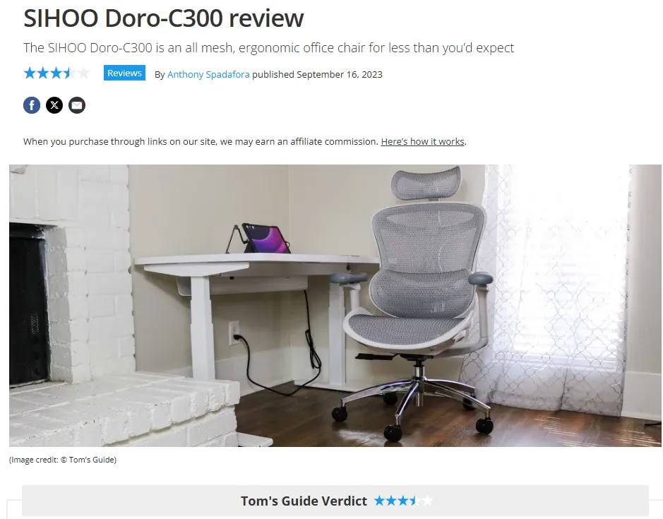 Tom’s Guide分别对 Doro-C300 和 Doro S300 做了独立评测。对 Doro-C300,Tom’s Guide 给出的核心评价是:这是一款价格低于预期、设计有辨识度的中端人体工学椅;对 Doro S300,则强调其更强的高级感、舒适性与人体工学体验。这意味着西昊在海外媒体中的品牌印象,已经不只是“便宜”,而是逐步延展到“设计、舒适、工程能力”。