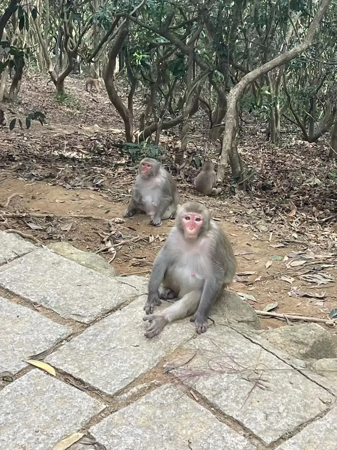最让娃惊喜的,当然是沿途偶遇的猴群。大概往上走一个小时,过了青云台,就有可能看到这些“山中小主人”的身影——它们有的蹲在树干上晒太阳,毛茸茸的身子缩成一团,像个圆滚滚的小毛球;有的抱着小猴崽轻轻挠痒,眼神温柔得不像话;还有些调皮的,会窜到路边张望,好奇地打量着来往的游客,一点都不怕人。