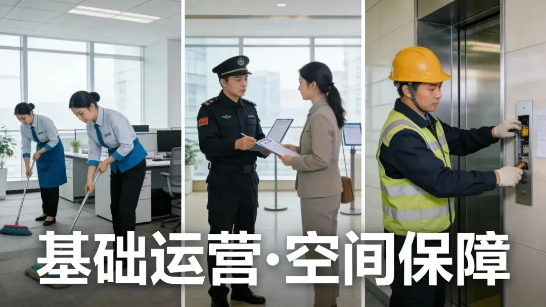 说白了,这一层就是做好基础空间载体:24小时安保、日常保洁、公共设施维修、水电空调正常运转,保证写字楼干干净净、能正常办公就行。