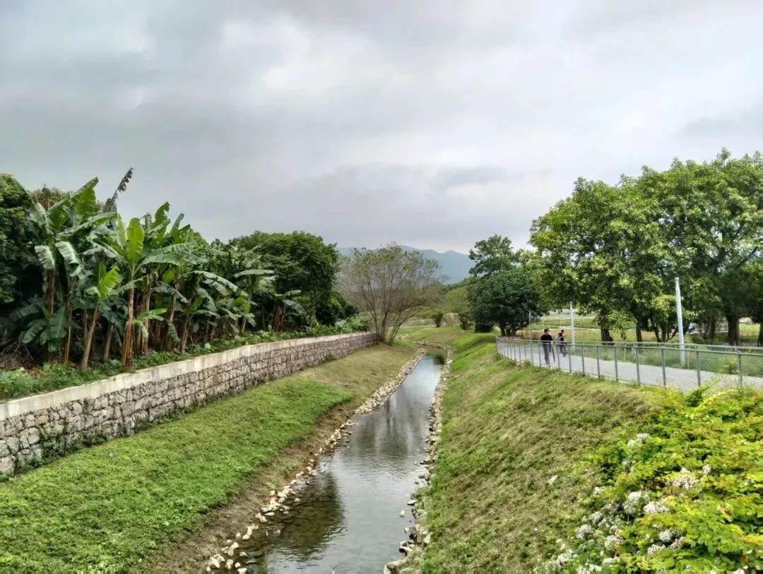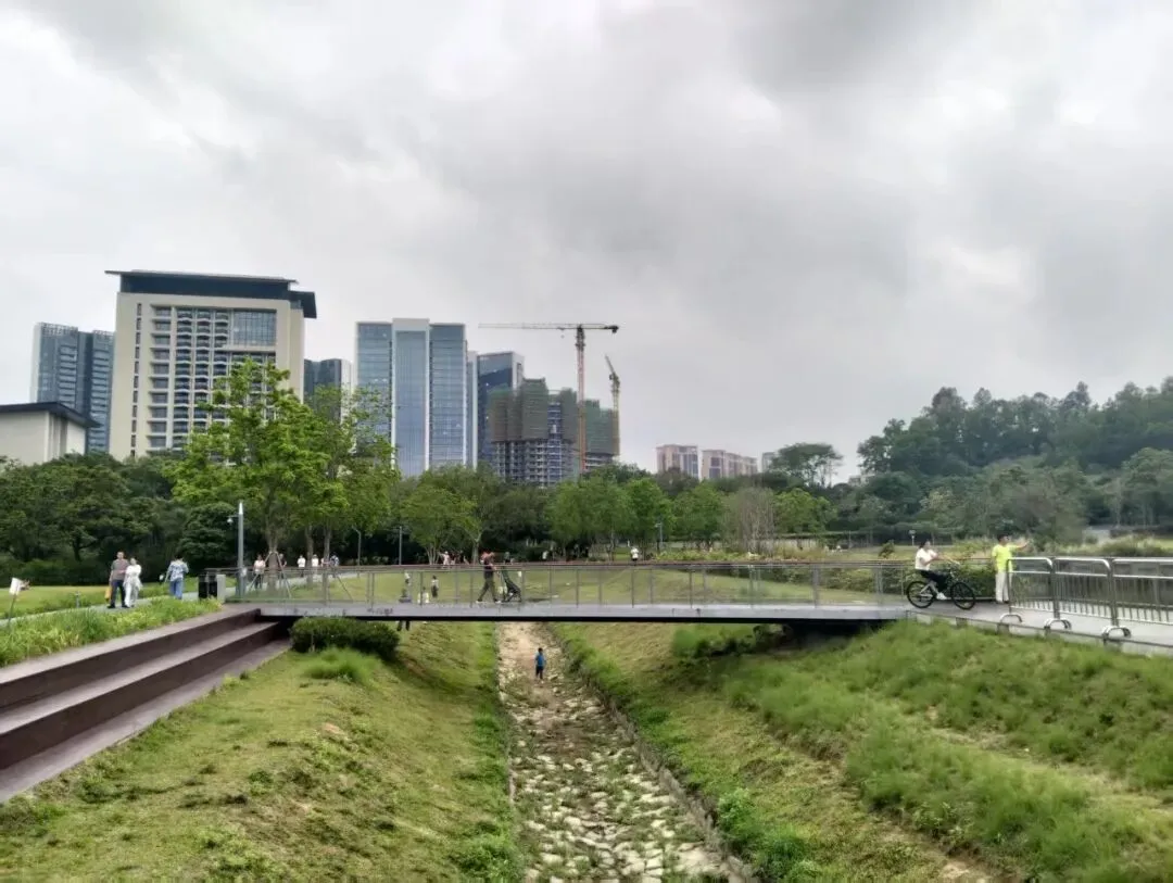 碧道主要是黑色沥青路面,平坦、干净,走起来很舒服。偶尔有一段木板栈道,踩上去哒哒响,但只是点缀。一路上遇到不少骑行爱好者,弯着腰,从身边嗖地过去,留下一阵风。更多的是带孩子的家庭——有的推着婴儿车,有的牵着小朋友的手,有的孩子在前面跑,大人在后面追。经过河道的时候,看到几个孩子脱了鞋在水里踩,旁边的大人坐在石头上看着笑。