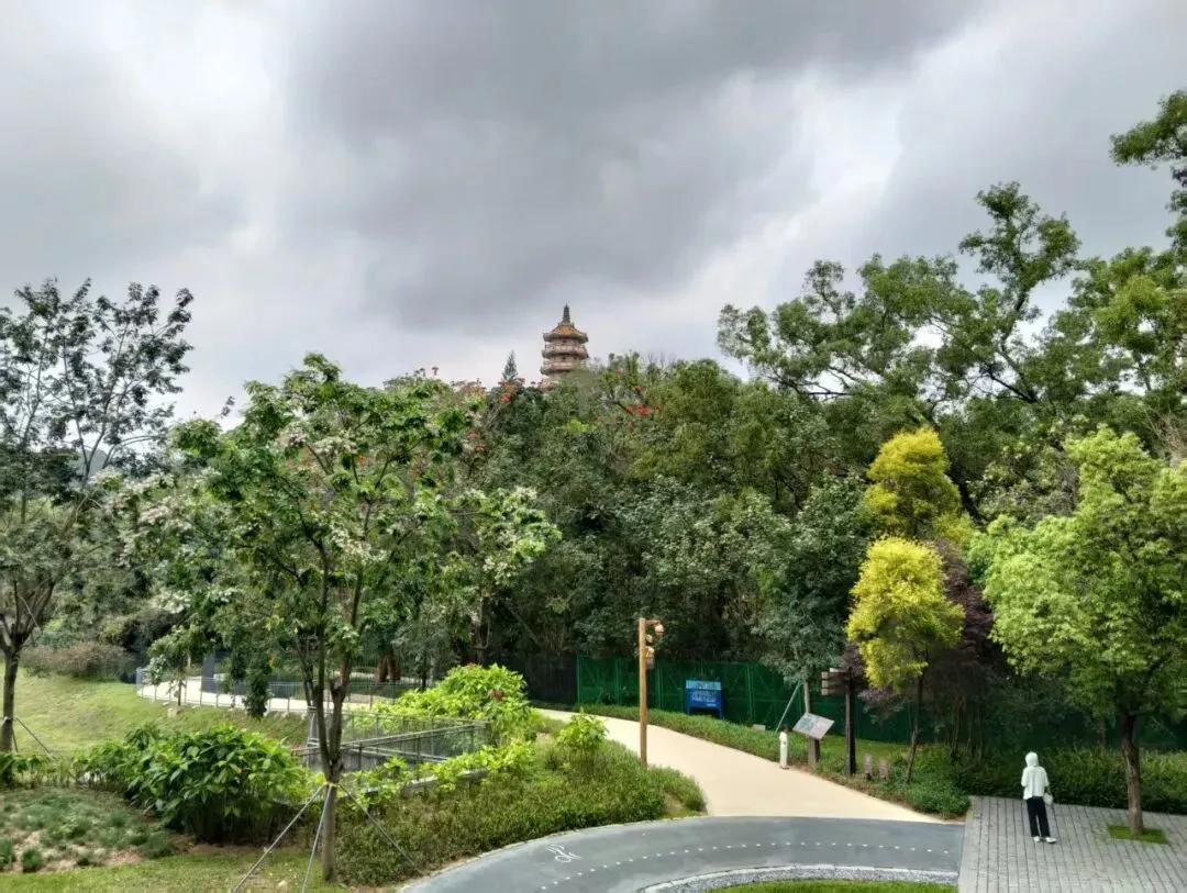 走到夕阳平台,视野突然开阔。西丽湖就在眼前铺开,阴天的湖水是沉静的绿,像一块翡翠嵌在山谷里。远处是西丽塔,八角飞檐,在树梢和天空之间。
