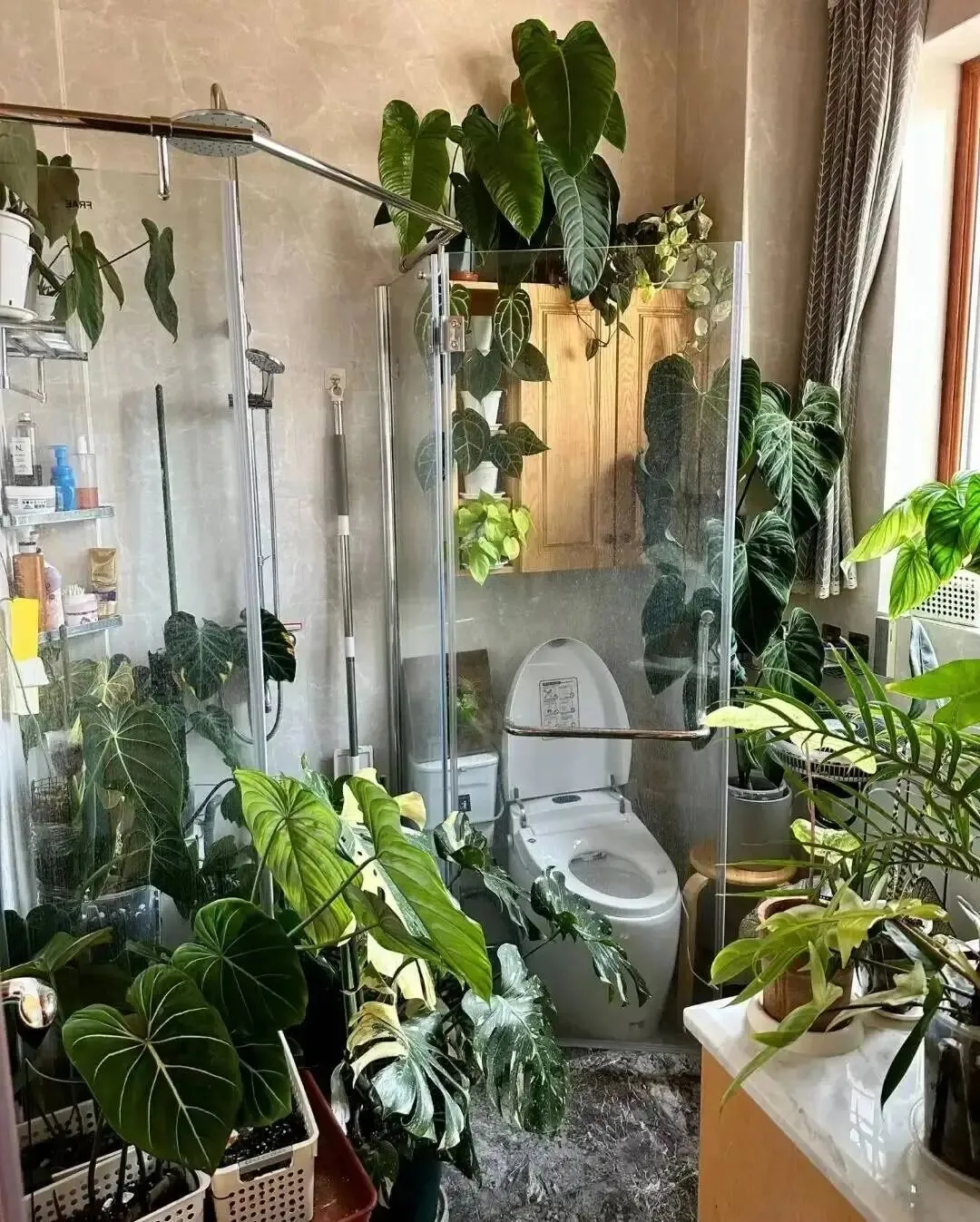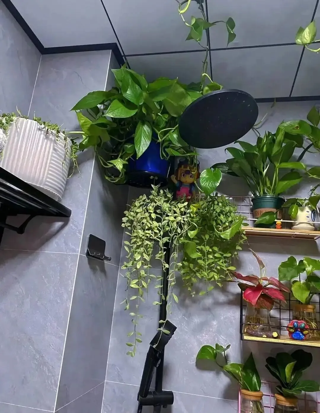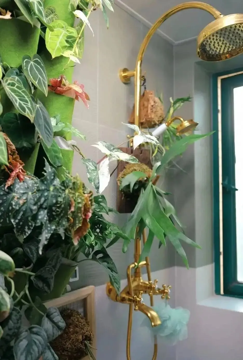 还有这种把吊兰、绿萝、球兰全往花洒边上安排的,植物从天花板垂下来,洗个头都像在丛林里穿越。网友说得很损,“我可以在这里呆到得痔疮。” 但你别说,真有那个味儿。