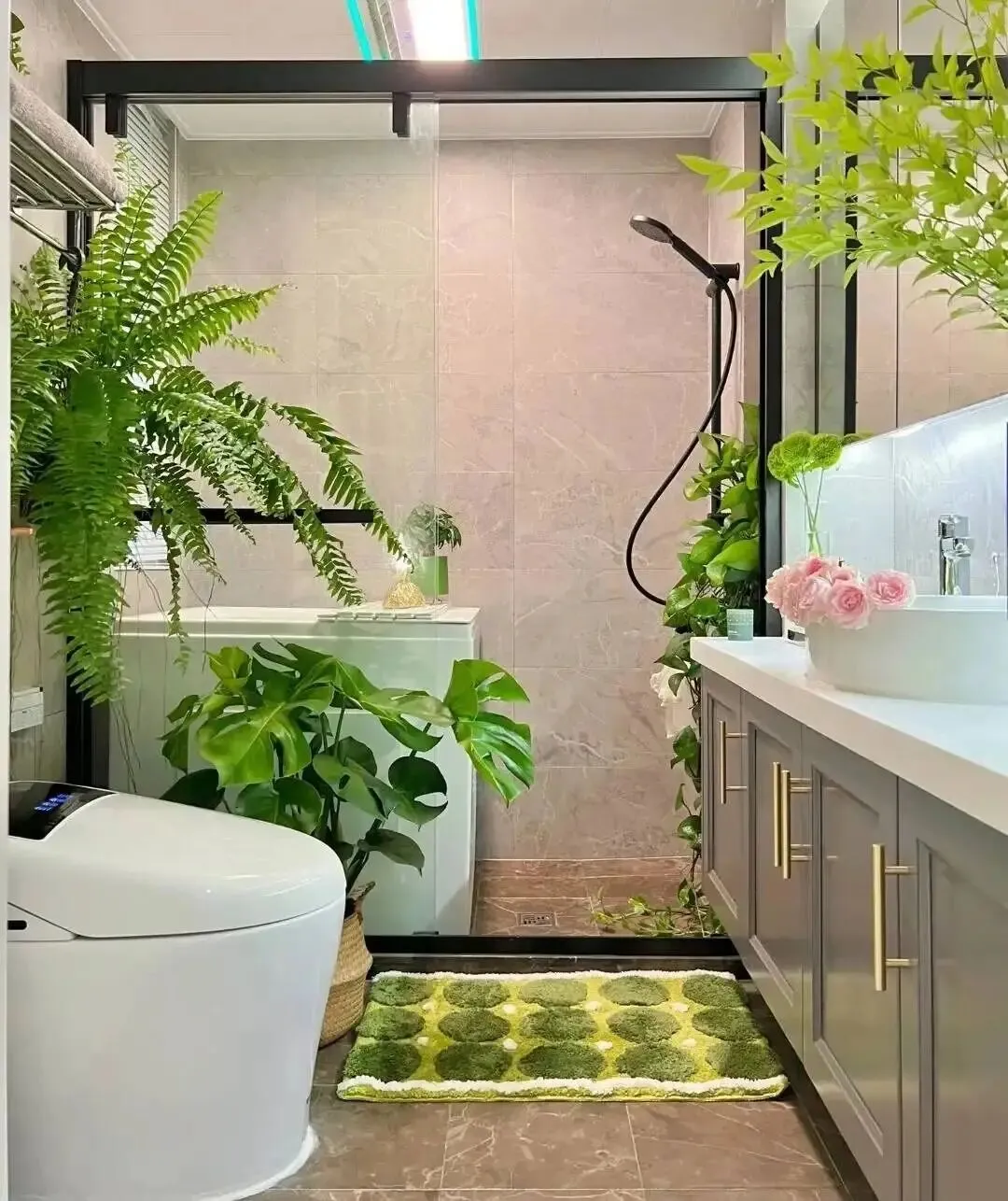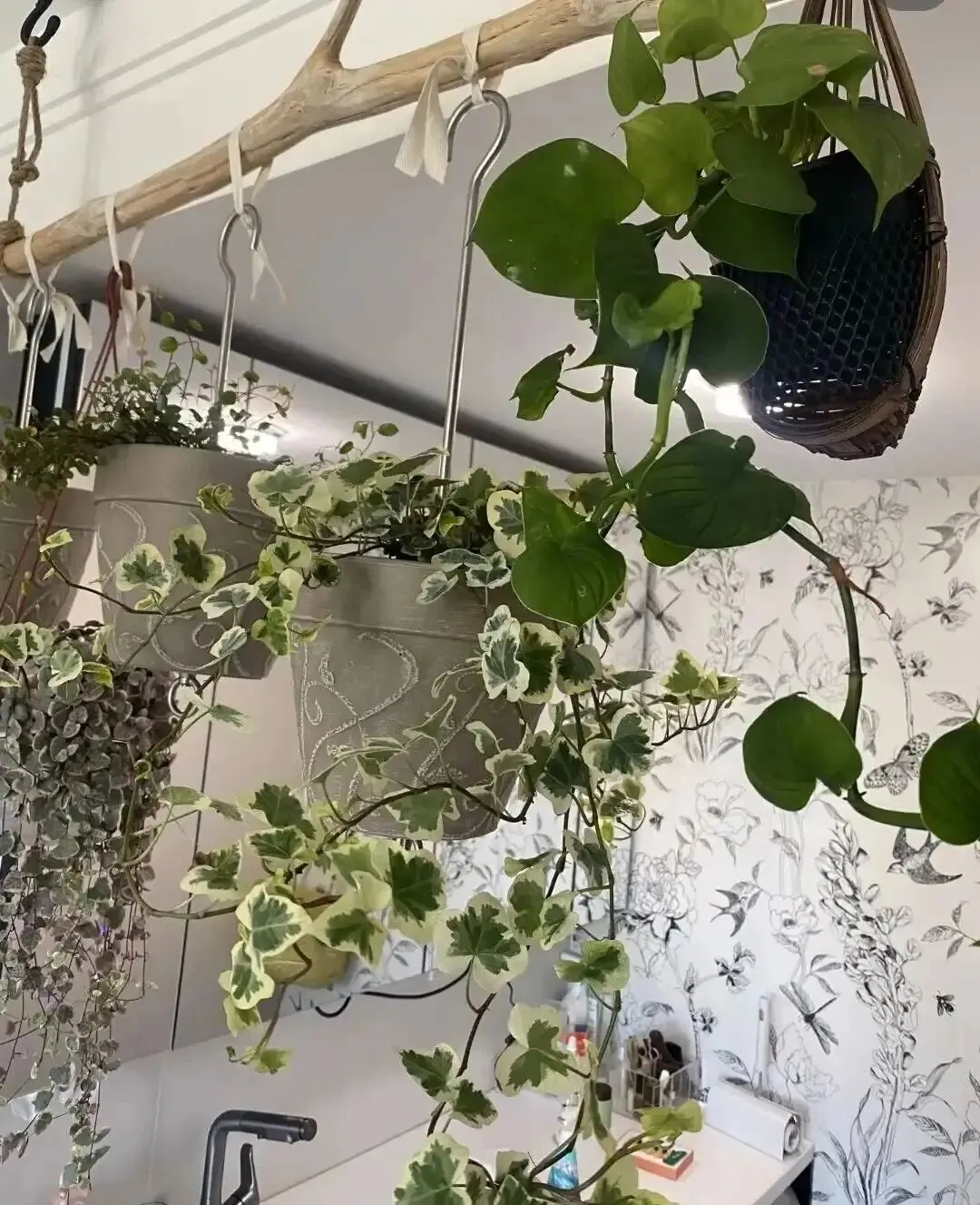 还有人不满足于墙面,干脆连顶部都利用起来。挂盆、藤本、垂吊植物齐上阵,抬头不是浴霸,是一串串往下坠的绿意。说白了,卫生间这个地方,只要通风别太差,真的是某些耐阴植物的快乐老家。
