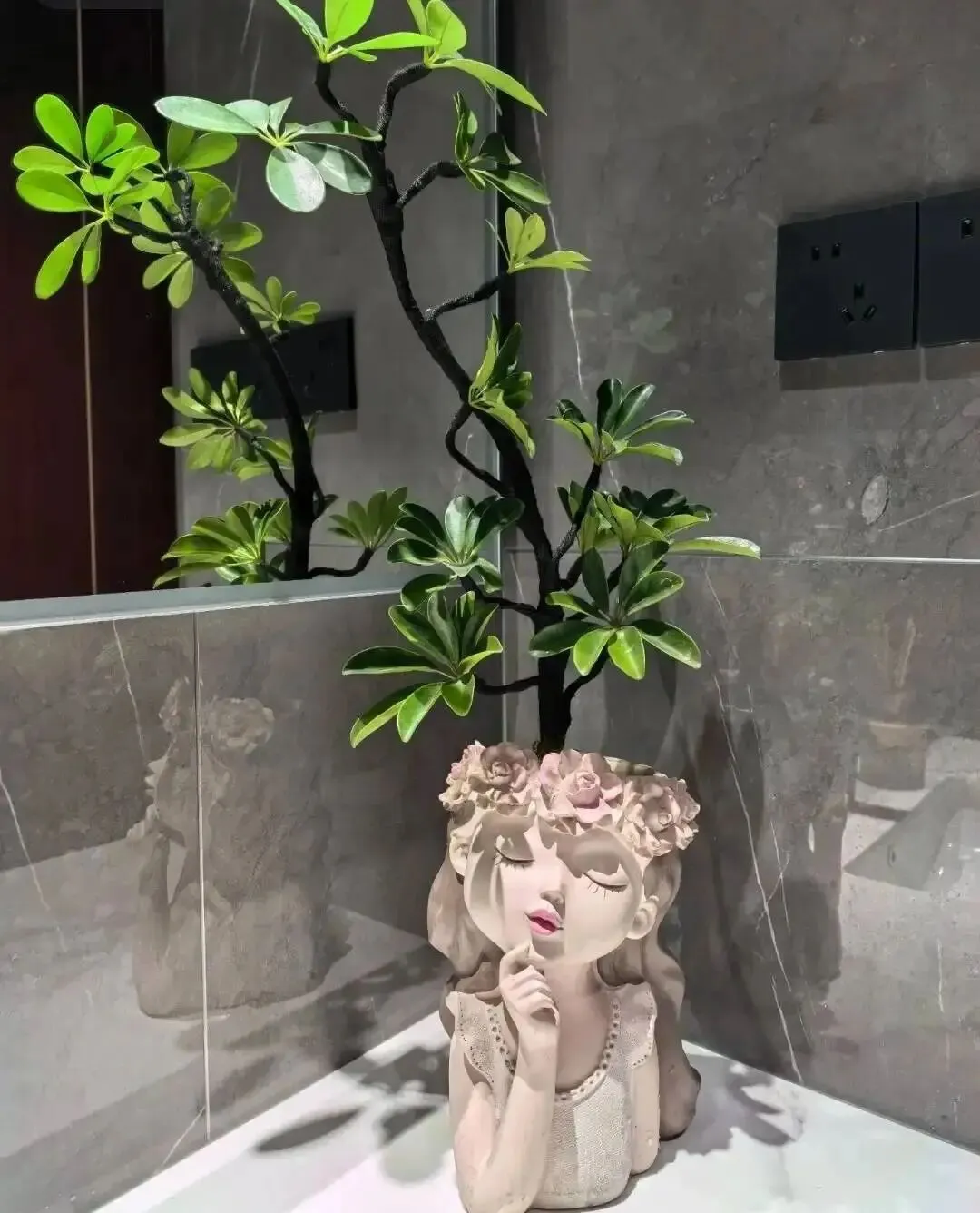 还有人走装饰派,花盆都不肯将就。一个少女头像盆栽,配上枝条舒展的小木本,卫生间立刻不“功能化”了,变得像家里最柔软的角落。说到底,现在大家爱在卫生间养植物,不只是为了好看,是想给自己造一点情绪缓冲区。