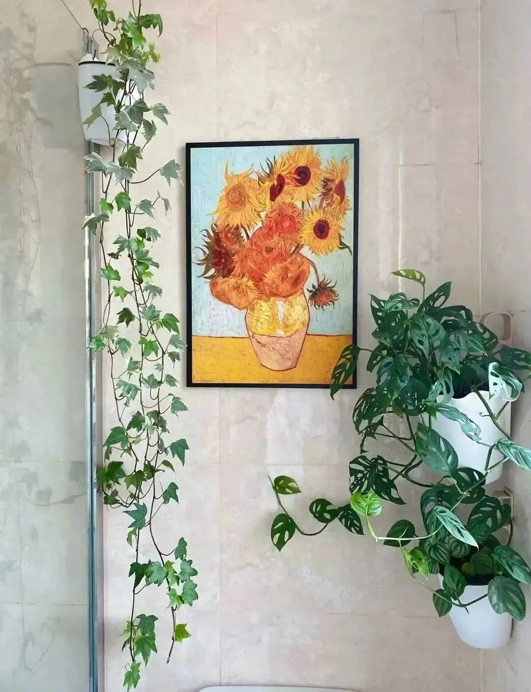 更绝的是,有人直接在淋浴区做整面植物墙。洗澡时水雾一打,叶片油亮发光,空气湿润得像刚下过雨。像绿萝、吊兰、白掌、龟背竹这类,确实都挺吃这一套,高湿环境反而容易出状态。