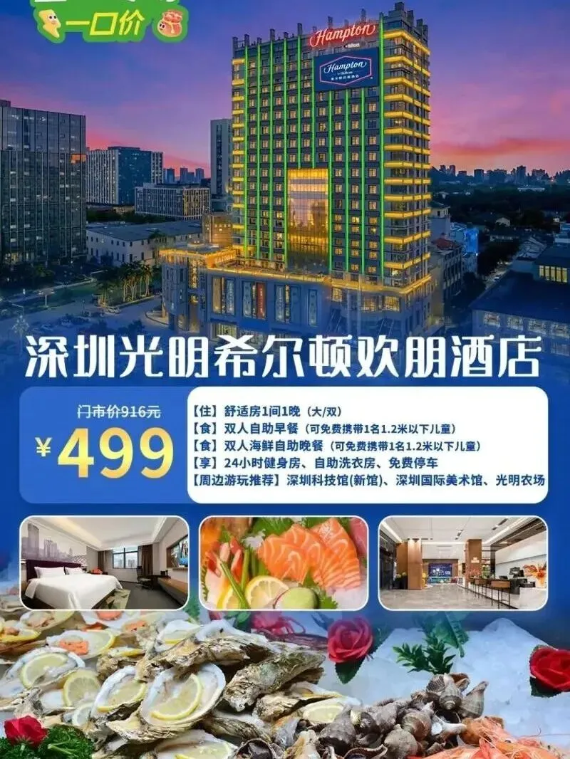深圳光明希尔顿欢朋酒店:舒适房(含双早+海鲜自助晚餐)【住】舒适房(大床或双床)床型规格:大床1.8m*2m一张,双床1.2m*2m单人床两张,房间面积:30平方,楼层7-9层,1间1晚(1份)【食】双人自助早餐(可免费携带1名1.2米以下儿童)(1份)【食】双人海鲜自助晚餐(可免费携带1名1.2米以下儿童)(1份)【周边游玩推荐】深圳科技馆(新馆)、深圳国际美术馆、光明农场(1份)购买须知