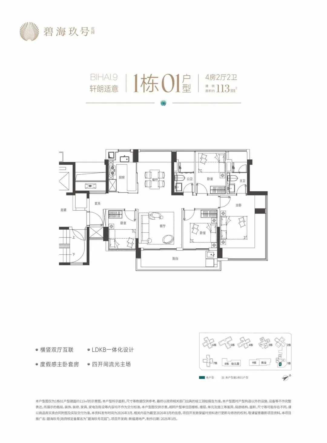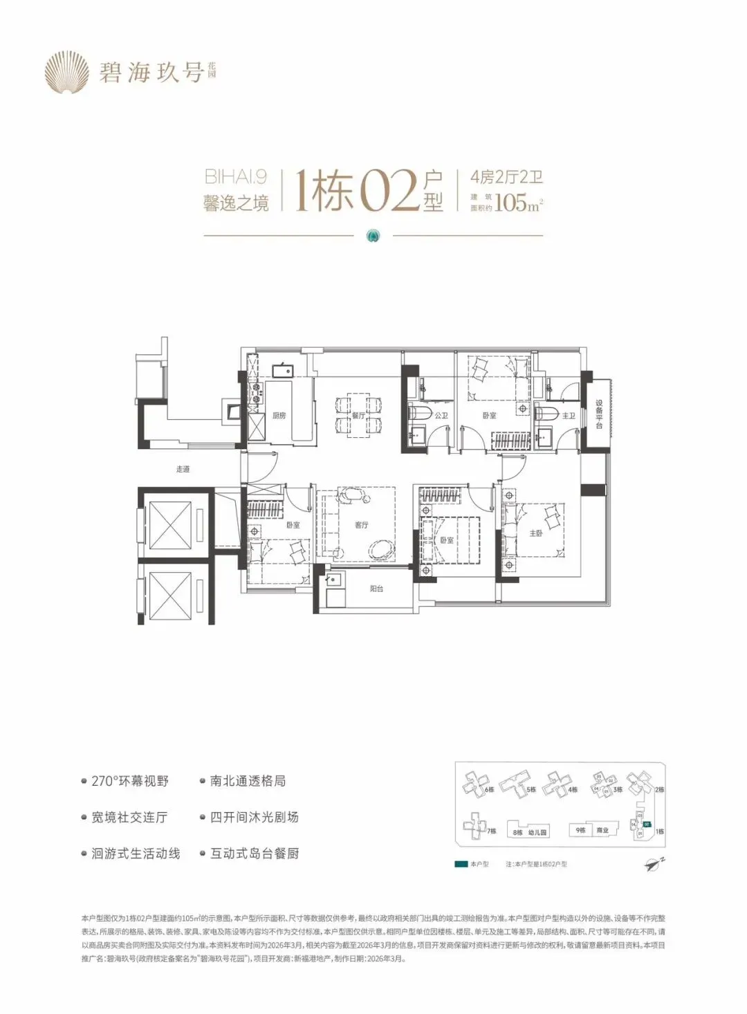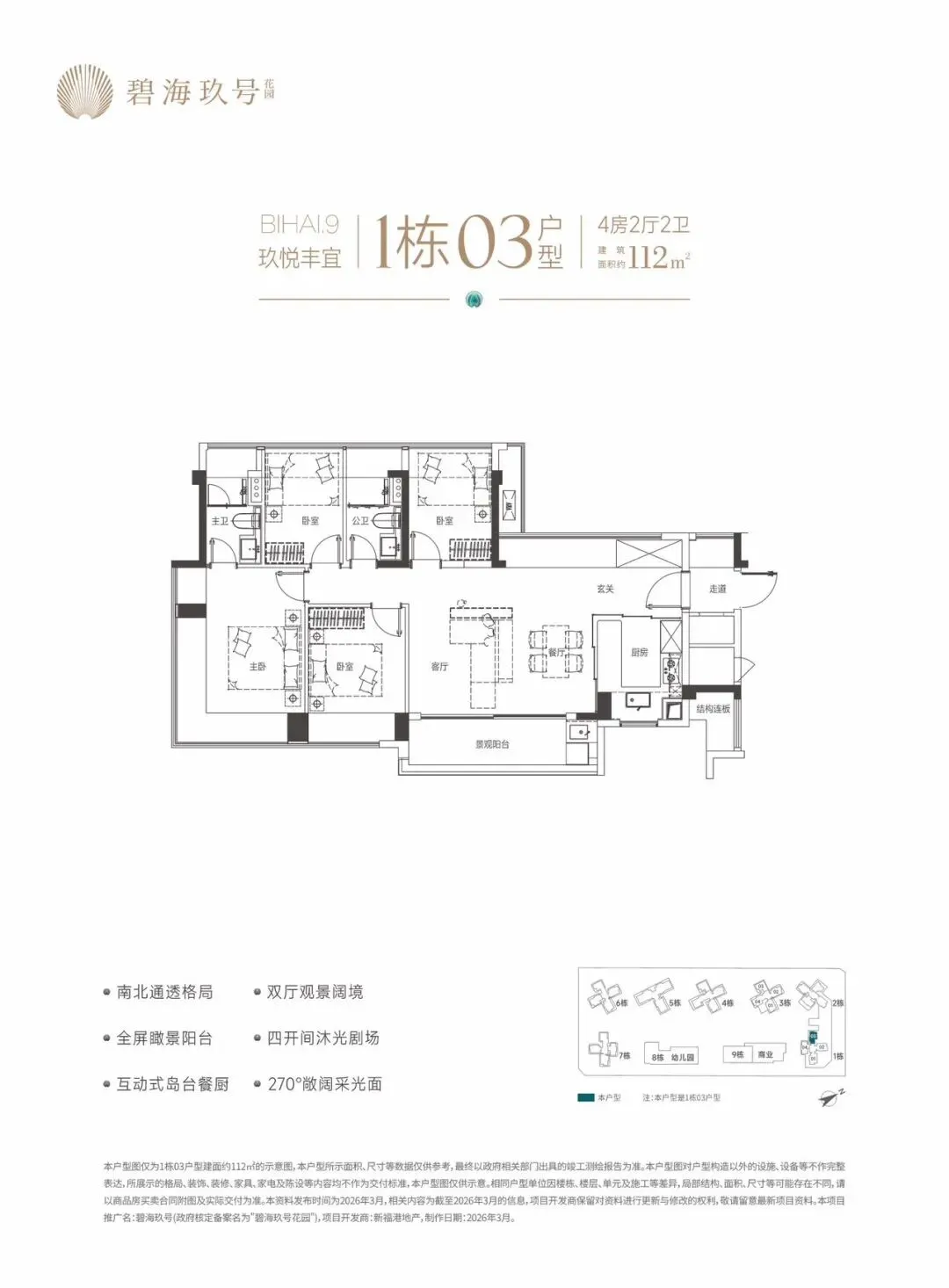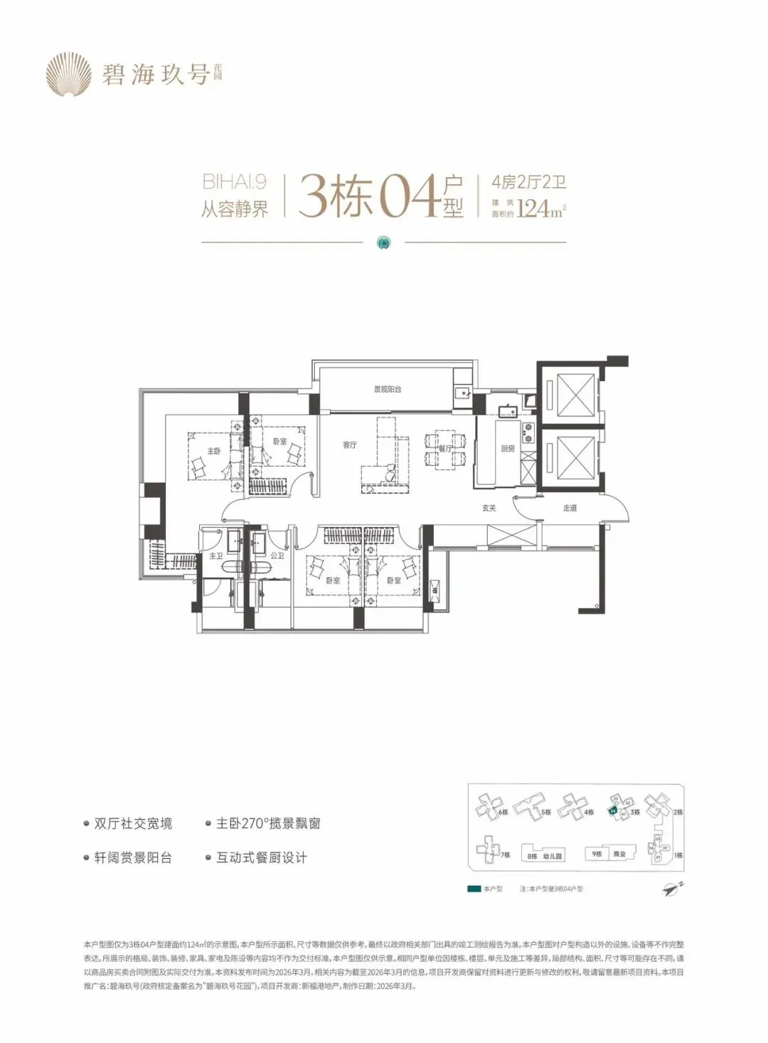 特别说明:本宣传资料为要约邀请,不构成要约和承诺。所示内容仅供参考,一切内容以政府最终批准文件、买卖合同及补充协议为准,如有变化恕不另行通知;本宣传资料文字、图片所表述的内容与实际可能存在一定差异;本宣传资料文字、图片所示内容在建设过程中可能会因政府及其下属单位或公共事业单位的要求等原因而变更;本宣传资料对项目周边环境、交通、商业、公园、医院、文化设施及其他公共设施的介绍,仅供参考,一切以政府相关文件及实际情况为准;本宣传资料关于项目的学区划分和学位申请条件以政府教育主管部门和相关学校的最终文件为准,本公司对此不作承诺,关于学区划分和学位申请的条件须前往主管部门及学校进行咨询。敬请阁下在选择购买房屋前,亲临现场,对周边环境仔细考察后再做购买决策;本公司保留对本宣传资料修改的权利,敬请留意最新资料。项目推广名:碧海玖号,备案名:碧海玖号花园,项目开发公司:深圳市锦新明集团有限公司。制作时间2026年4月。