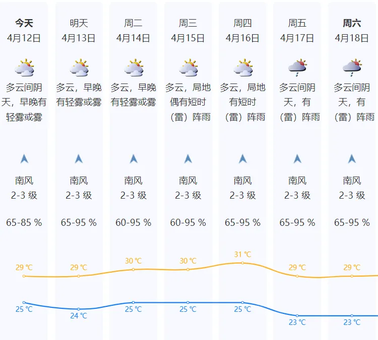 深圳今日多云间阴天,早晚有轻雾或雾,气温25-29℃。
