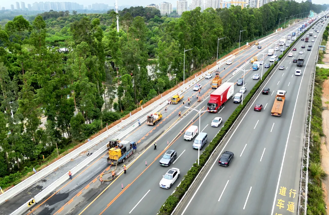 ● 日前,莞深高速北段主线K46+400至K42+400(广州至深圳方向)交通导改施工顺利完成,导改路段全长4公里。项目主线将由双向6车道拓宽为双向10车道,部分路段达12车道。