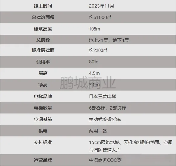 【物业费用】:每平方米每月34.5元,涵盖工作日(周一至周五)早8点至晚8点的空调使用费。