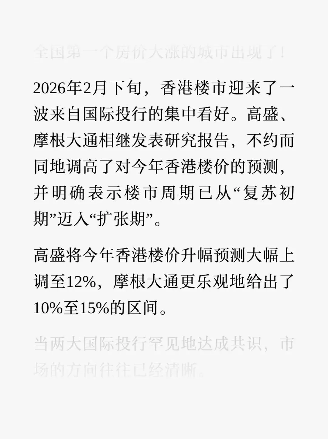 高盛此前也指出,自2025年中以来香港住宅市场已经见底,资本市场活动活跃及经济复苏为楼市提供了坚实支撑。