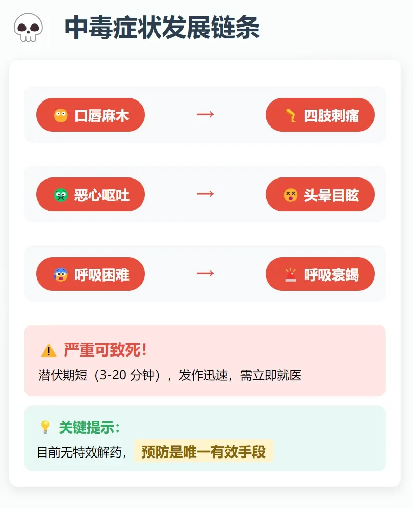 - 麻痹性贝类毒素:初期表现为口唇、舌尖刺痛、麻木,随后麻木感扩散至面部、颈部、四肢,伴有头晕、恶心、呕吐,严重时会出现肌肉麻痹、呼吸困难、窒息死亡,起效极快,根本来不及反应;