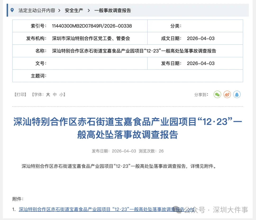 报告显示,2025年12月23日13时30分许,深圳市深汕特别合作区赤石街道宝嘉食品产业园项目发生一起高处坠落事故,造成1人死亡,直接经济损失约117万元人民币。