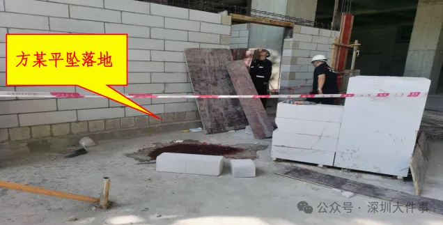 调查报告显示,2025年12月23日12时许,深圳恒泰沣公司员工方某平与妻子徐某琴及工友夏某威、夏某四人在宝嘉食品产业园项目2#楼东侧5层进行内墙砌筑及墙面抹灰作业,方某平在5层东侧风井口旁位置进行风井口墙体抹灰作业,徐某琴负责为其运送砂浆;夏某威在距方某平约5米处进行砌砖作业,夏某为其运送砂浆。