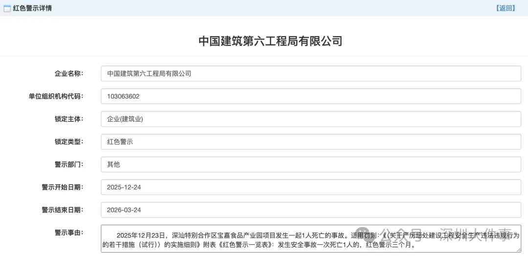中建六局第四建设有限公司及其母公司中国建筑第六工程局有限公司,因关联宝嘉食品产业园项目生产安全事故,被深圳市住建局予以红色警示3个月。警示期自2025年12月24日起至2026年3月24日止。