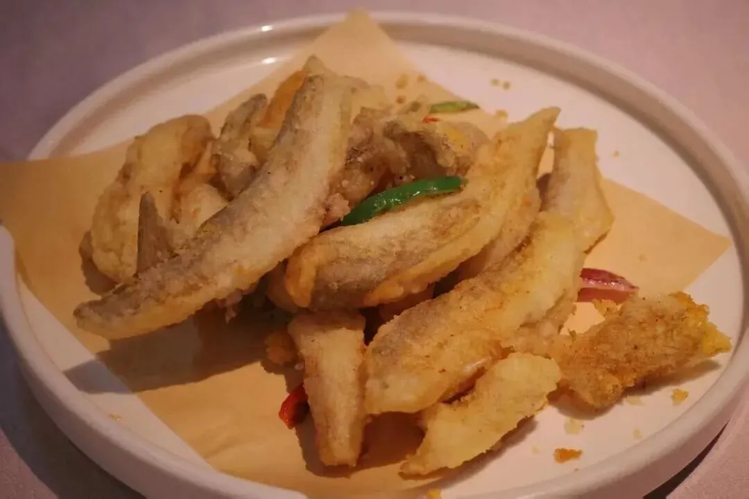 周末去大概率要排队,但等待绝对值得。菜单上的小鱼小虾种类丰富,煎炸蒸焗应有尽有,盲点不踩雷。椒盐九肚鱼一定要点,一大盘端上来,金黄油亮,撒上青红椒碎和炸蒜末,香气扑鼻。外皮炸得酥脆,一碰就掉渣,内里鱼肉嫩滑无刺,咸香中带着一丝微辣,越嚼越香,不用吐刺,吃起来毫无负担,分分钟就能光盘。