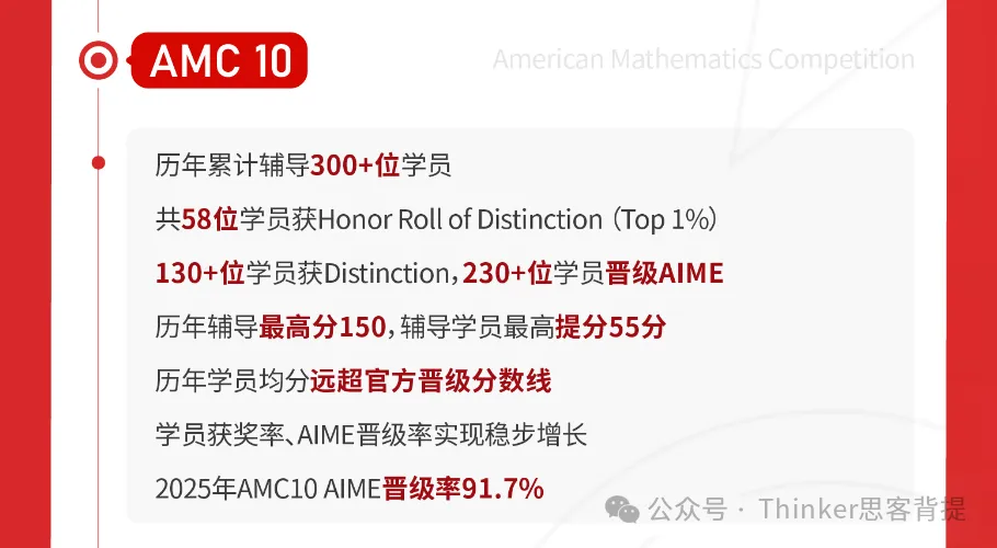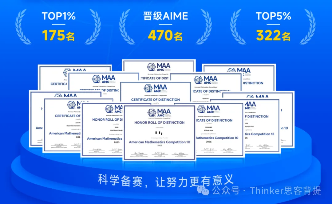 思客教育自2019-2026年至今,累计辅导300+名AMC10学员。2025年AIME晋级率91.7%!