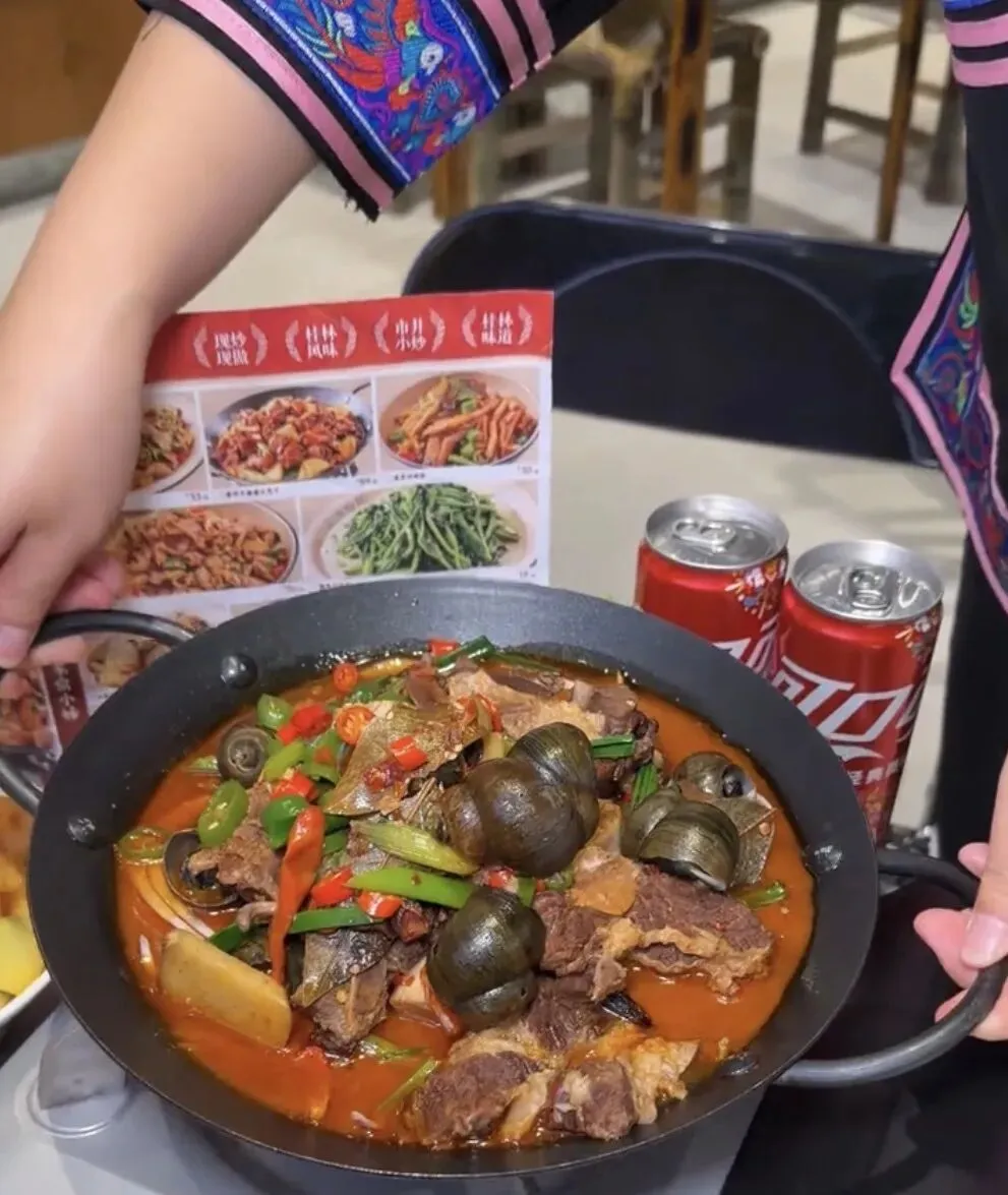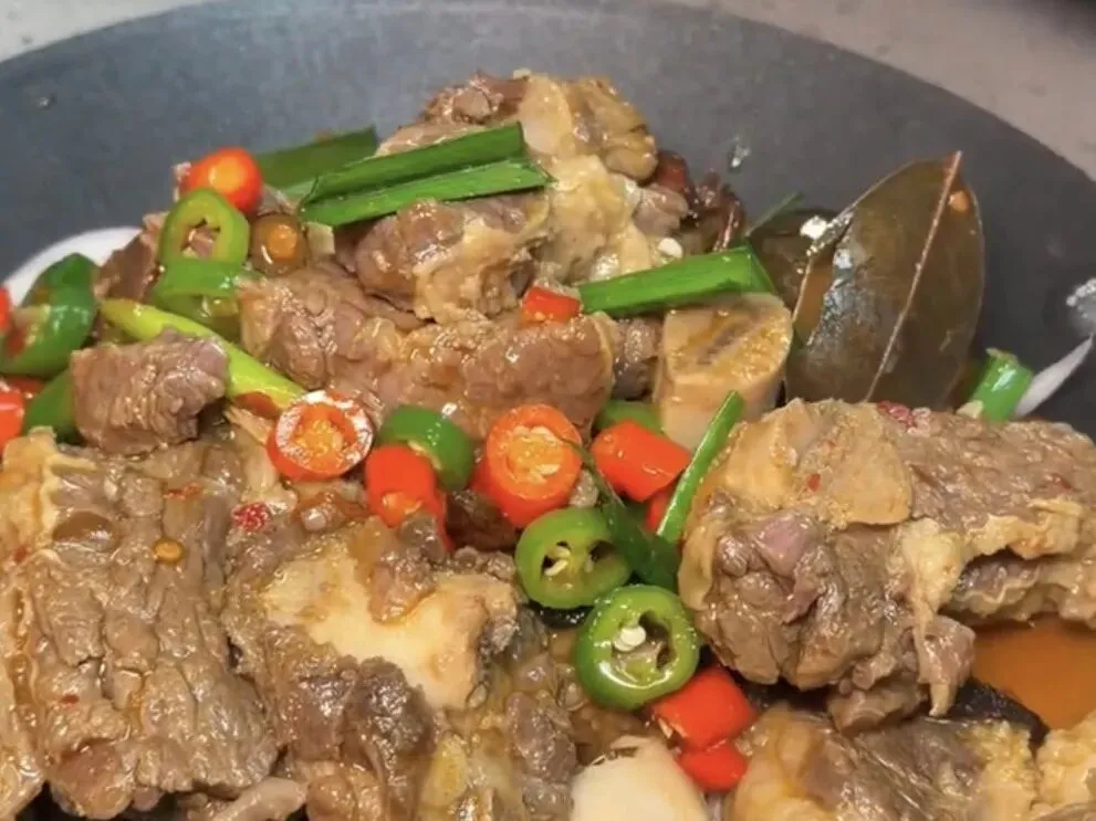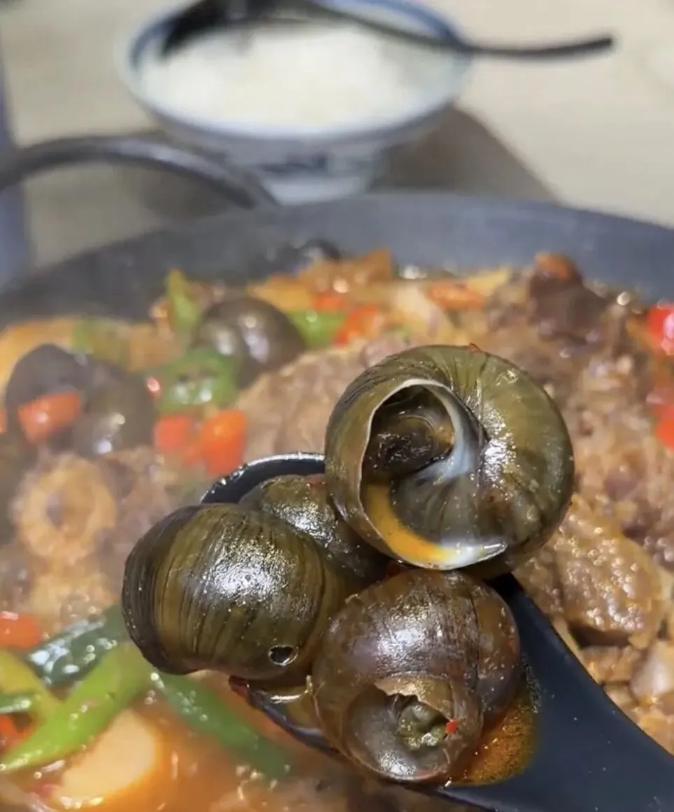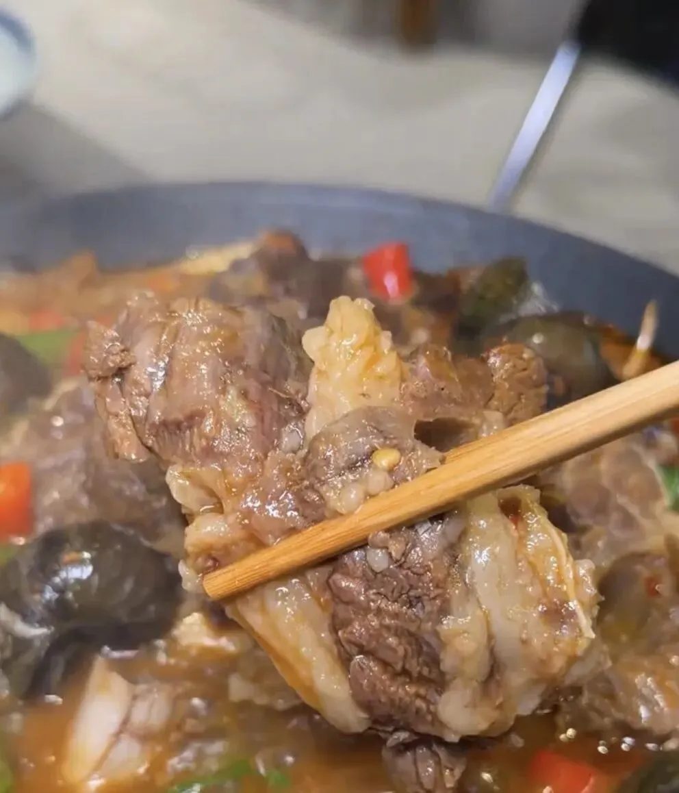 香辣田螺焖牛排一端上桌,香味瞬间散开。牛排炖煮得软烂入味,轻轻一咬,肉就脱骨,田螺也吸饱了牛排汤汁的醇厚,香辣过瘾。田螺肉带着嚼劲,和软烂牛排搭配,口感超丰富,每一口都让人陶醉。