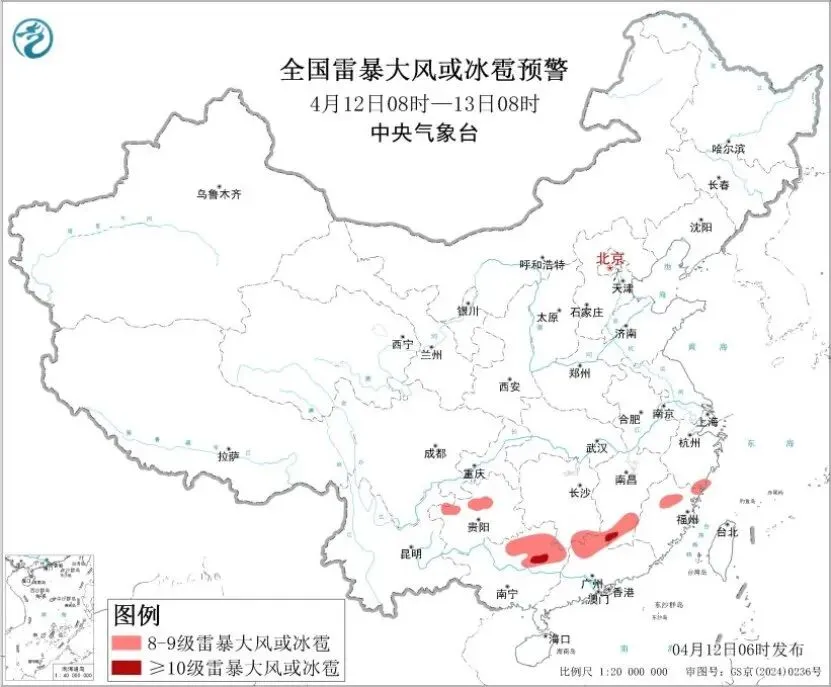 据中央气象台消息,4月12日08时至13日08时,江南东部和南部、华南北部、西南地区东部等地的部分地区将有8级以上雷暴大风或冰雹天气,其中,广西北部、广东北部、江西南部等地局地将有10级以上雷暴大风,最大风力可达11级以上;江南东部和南部、华南北部等地的部分地区将有小时雨量大于20毫米的短时强降水天气,其中,江西南部、广西北部等地局地小时雨量大于50毫米。