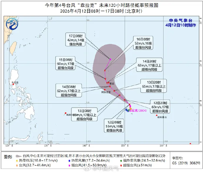 今年第4号台风“森拉克”已于今天上午由强台风级加强为超强台风级,也是今年首个超强台风。预计,“森拉克”将以每小时15-20公里左右的速度向西北方向移动,强度继续加强,并逐渐靠近美国关岛附近洋面,14日夜间逐渐转向偏北方向移动。未来“森拉克”对我国近海无影响。广东省气象台预计,今天(4月12日)至14日,受西南气流影响,广东省大部多云为主,其中,韶关、清远、肇庆北部市县间中有(雷)阵雨局部大雨,早晚部分市县有轻雾,雷州半岛有34℃~36℃高温。