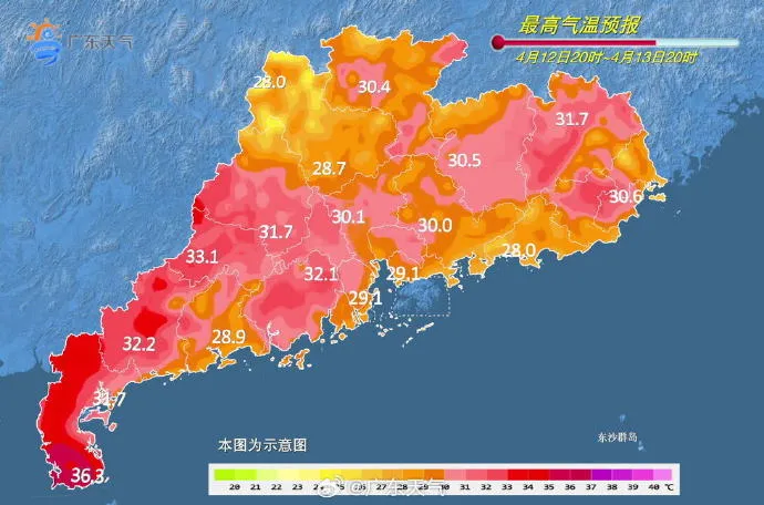 12-13日,韶关、清远、肇庆北部市县多云到阴天,有(雷)阵雨,局部有大雨或8级左右雷雨大风,雷州半岛晴到多云,其余市县多云间阴天,局部有(雷)阵雨,部分市县早晚有轻雾。白天最高气温:肇庆、云浮、茂名、湛江32℃-34℃(雷州半岛35℃-38℃),其余大部分市县29℃-32℃。