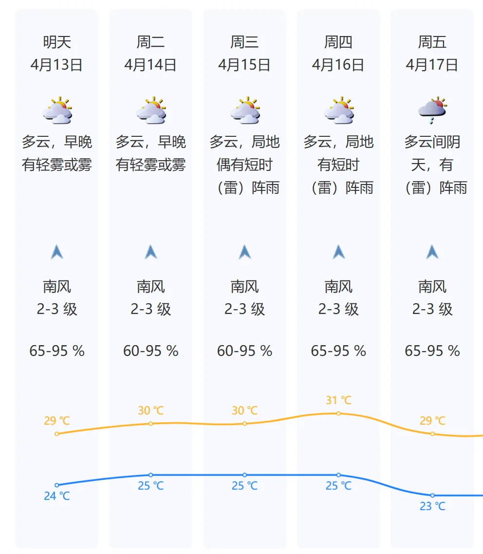 12-14日多云间阴天,早晚有轻雾或雾,间中局地偶有零星小雨,午间较热,12日气温25℃-29℃;