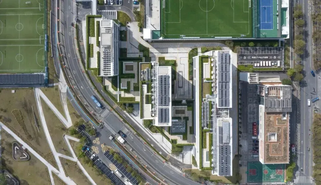 光伏板铺在足球公园训练场看台、停车场和连廊等区域,同时配置超充装置和充电桩,形成“光储超充,车网互动”的一体化场景。