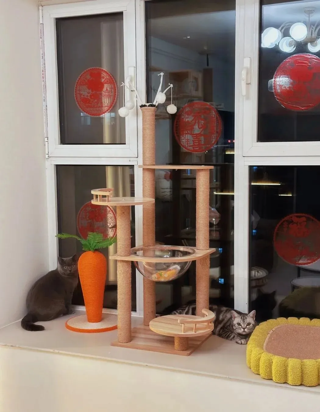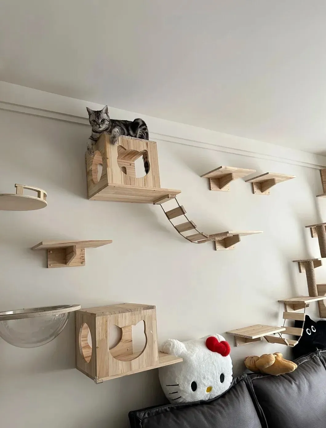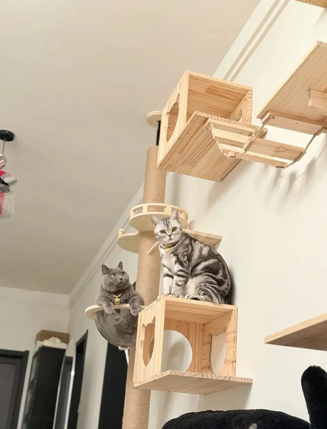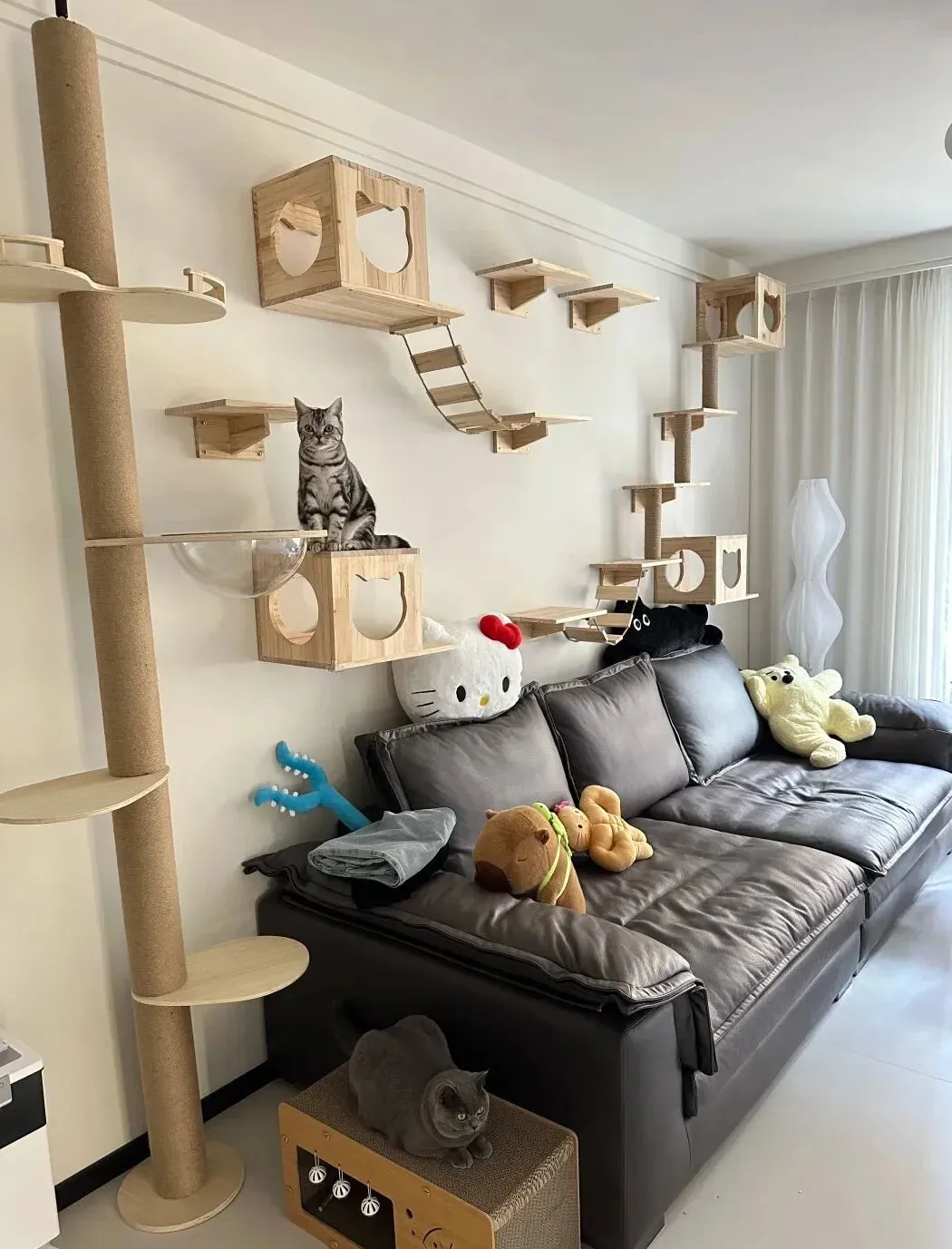 第三,质感落地:30万花在刀刃上,实用与颜值不脱节。他们选用的是ENF级环保板材,不用担心猫咪啃咬带来的安全问题;地面通铺防滑实木地板,猫咪跑跳不打滑,人走在上面也温润舒适;软装以原木色和奶白色为主,搭配少量莫兰迪色,简洁又高级,拍照发圈不用滤镜都好看。