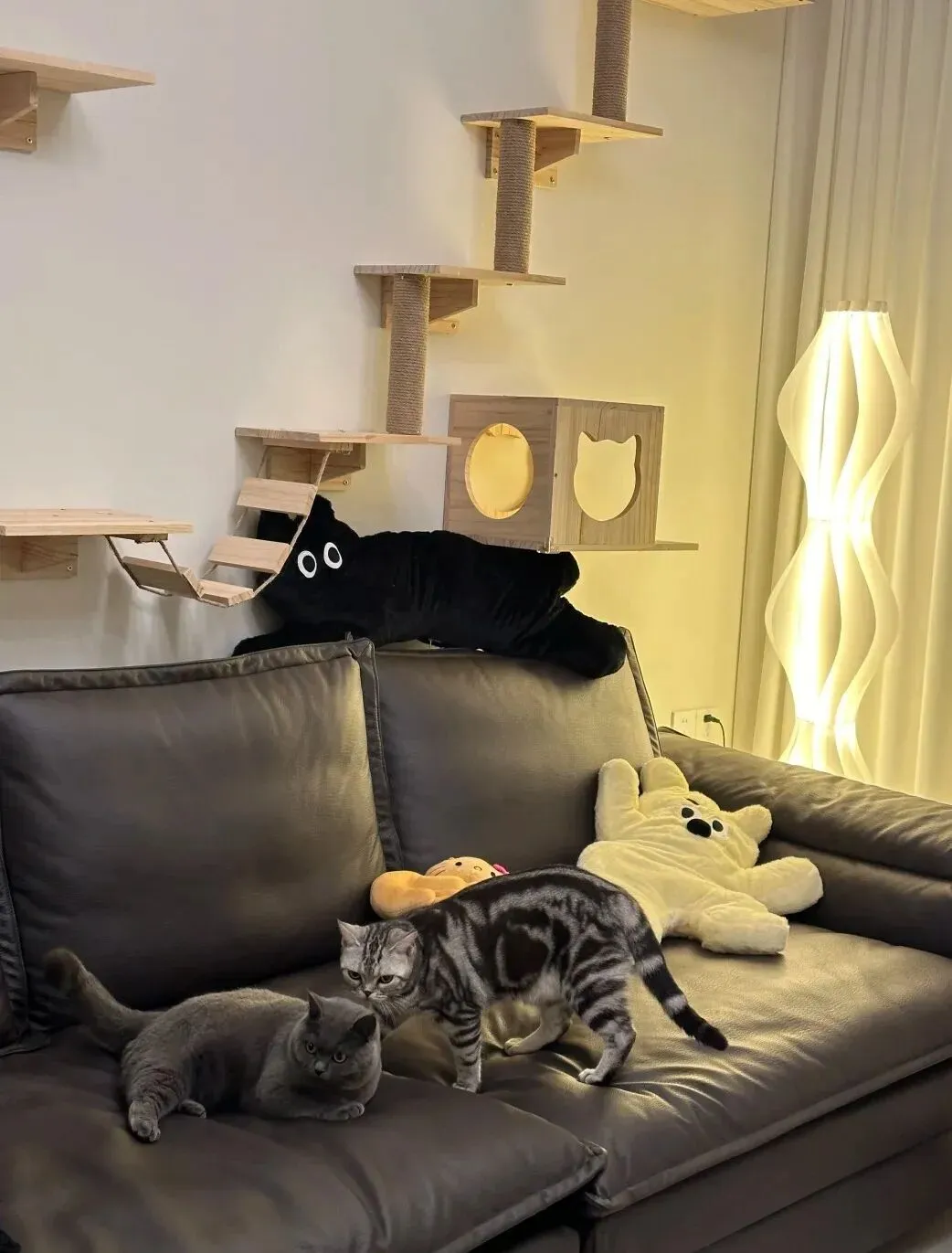 第二,猫咪友好:把家装成乐园,人和宠物双向奔赴。对这对丁克夫妻来说,猫咪就是家人,所以装修的核心的是“人和猫共存”。他们在全屋打造了专属猫咪的“动线系统”:背景墙做了嵌入式猫爬架,刚好适合猫咪攀爬眺望;走廊两侧做了隐藏式猫洞,猫咪可以自由穿梭;阳台定制了猫砂盆柜,兼顾收纳和隐蔽性。