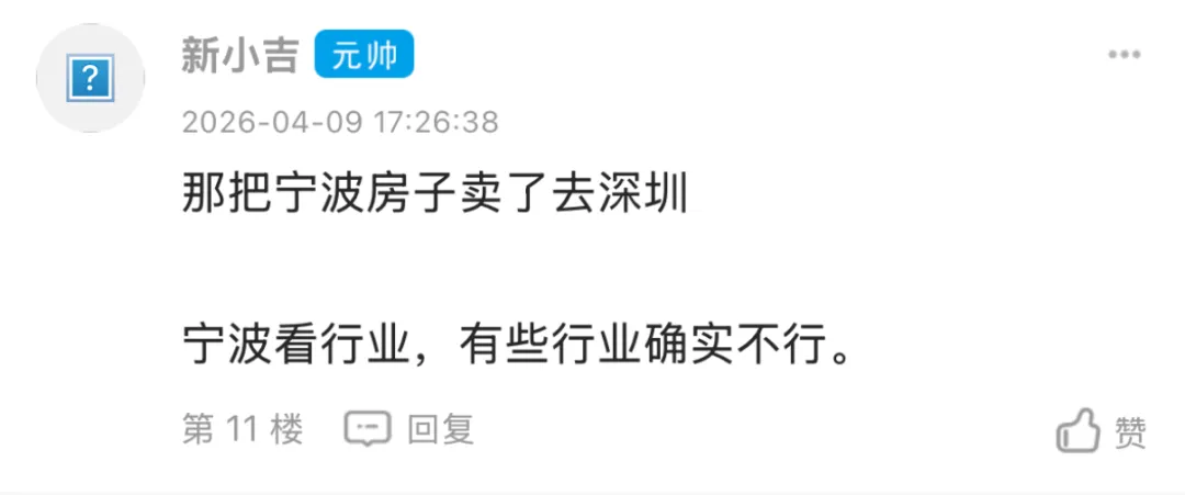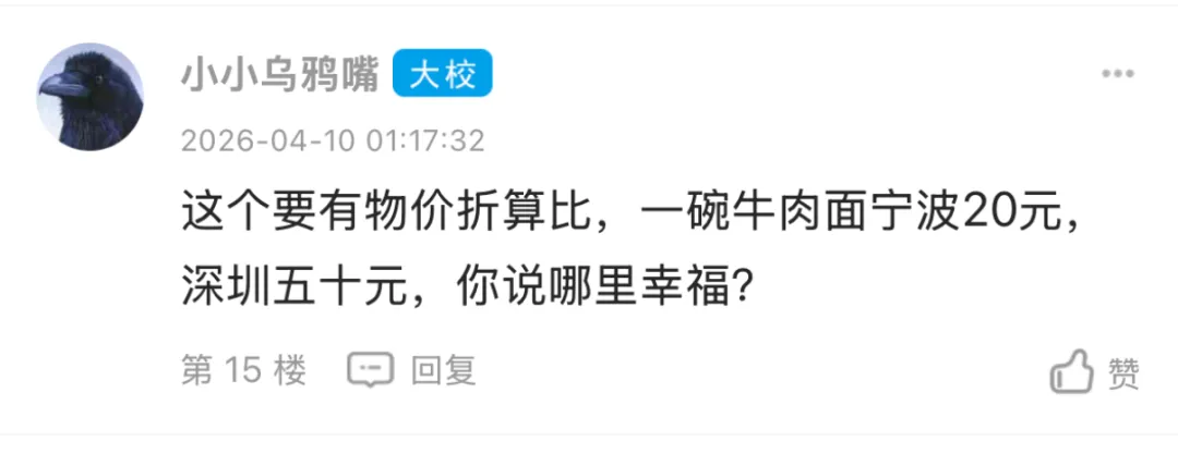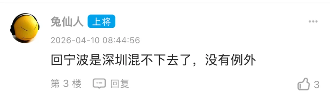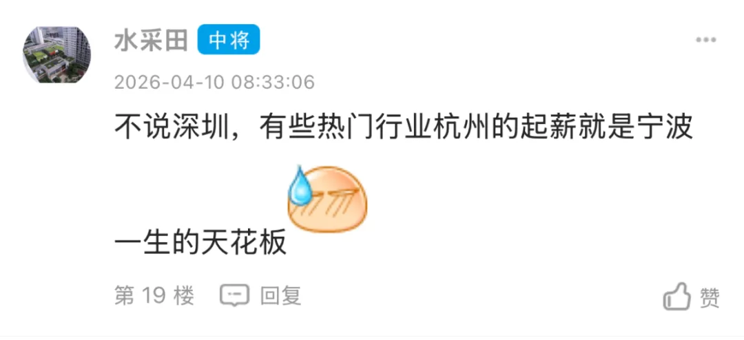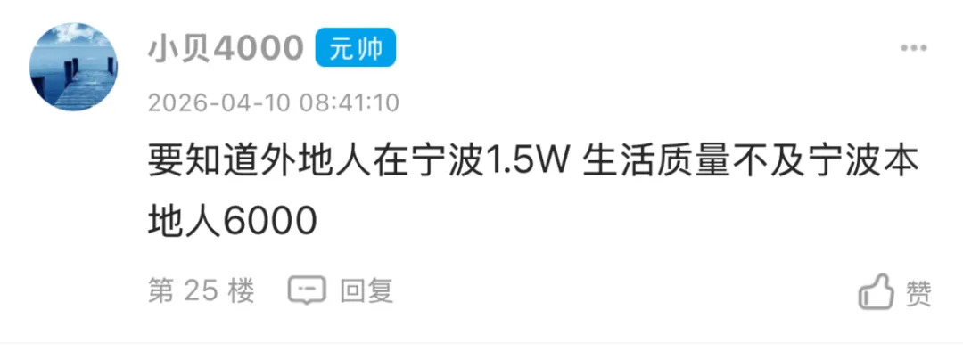 事情的起因是这样的。东论网友 @404pocky 发了个帖子,说朋友的孩子最近回宁波工作了。这孩子之前在深圳月入3万多,加班比较多,最近入职了宁波一家公司,月入1万多,直接打了“骨折价”。