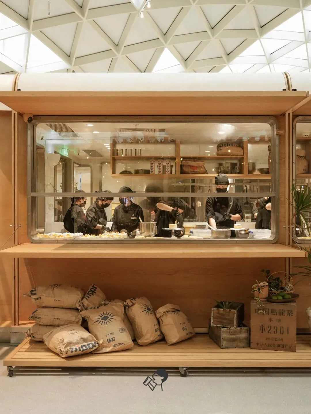 基于门店位处商业体中庭顶部的高空坐标,喜茶从经典产品元素“芝芝云顶”与cake lab的松软产品属性中提取造型灵感,在门店场景内融⼊云朵、餐车、茶箱和草垛等自然设计,将传统的制备区打造为一辆临时停靠的“云上列车”,外摆客座区的开放式设计模糊了门店与商场公共空间的边界,以轻盈、放松的场域氛围,为到访用户提供一个从快节奏的城市环境中短暂抽离的休闲空间节点。