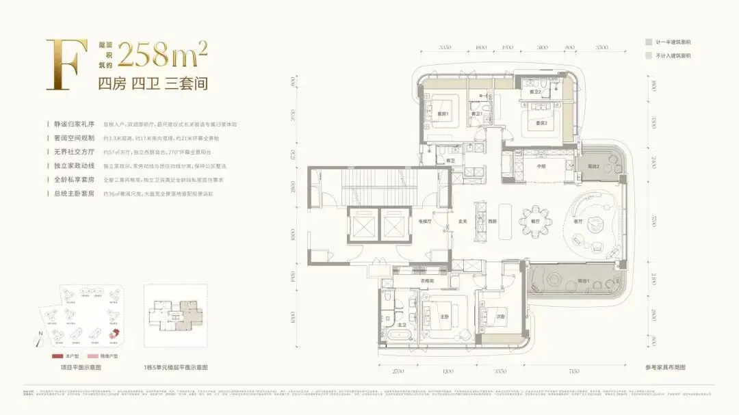 在户型空间打造上,项目主推建筑面积约143—500㎡环幕瞰海大平层,全系四房起步,保障居住人群纯粹性。依托新规优化设计,整体空间使用率有效提升;独立电梯入户,彰显归家仪式感与私密性;最大约17米南向面宽、7.7—21米阔景阳台、270°环幕视野,将海景、城市地标、园林景观等多重景致尽收眼底;最高约3.3米层高拓展室内通透感,多套房精细化布局,适配高阶家庭常住、待客、多代同住的多元需求。在这里,景观不再是窗外点缀,而是融入客厅、餐厅、卧室等每一处生活空间,让居住者在日常中尽享世界滨海CBD的优质视野。