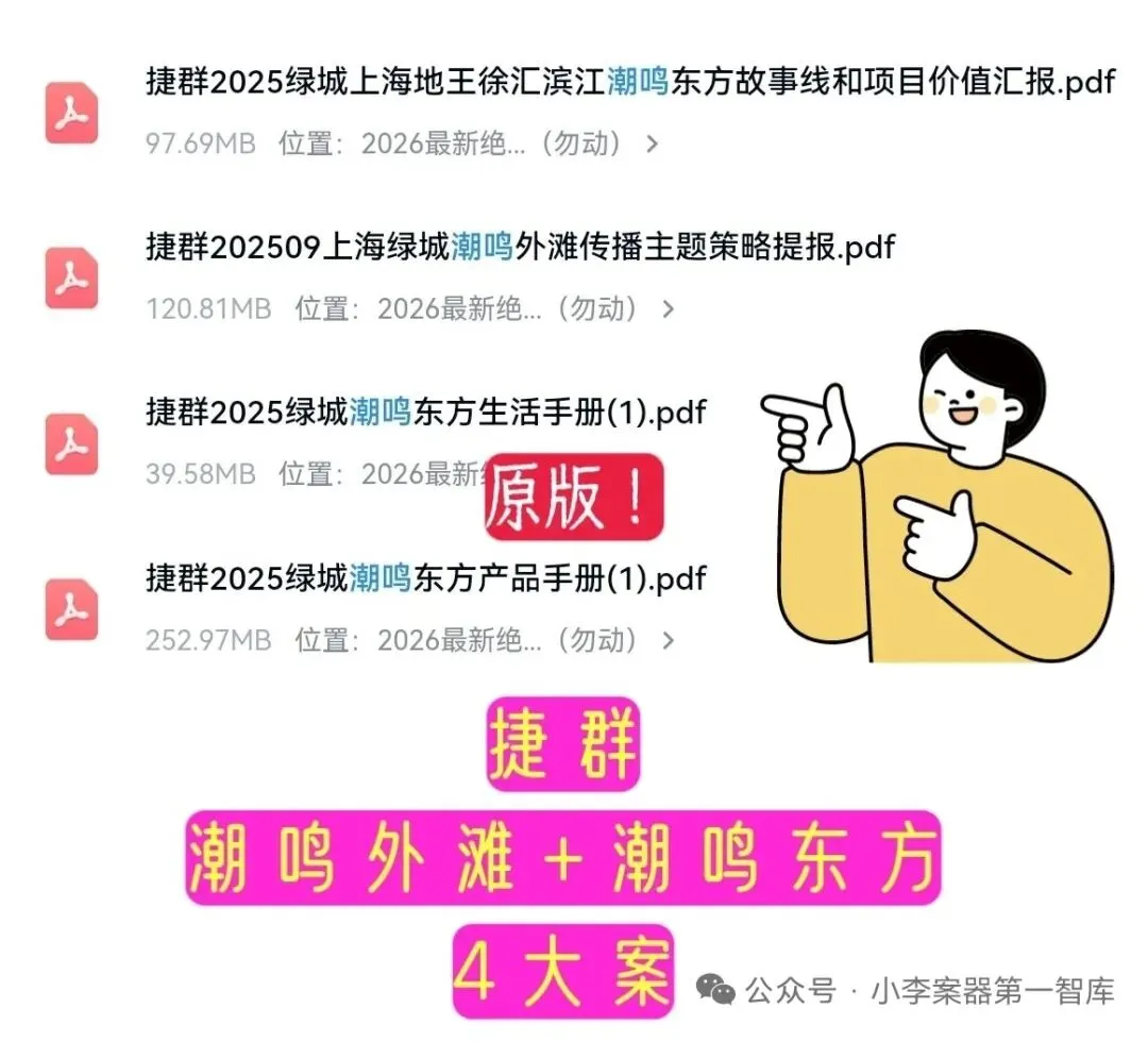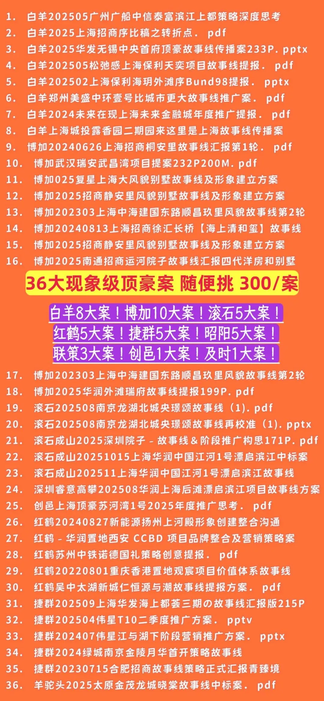 1. 创邑202507上海壹号院锦华里风貌别墅故事线提报.pdf 2. 捷群202408上海壹号院锦华里风貌产品故事线建构330P.pdf 3. 捷群2025绿城上海地王徐汇滨江潮鸣东方故事线和项目价值汇报. pdf 4. 捷群202509绿城潮鸣外滩故事线提报. pdf 5. 白羊202601金茂满系上海首作故事线思考286P. pdf 6. 创邑2024上海宸嘉100品牌构想. pdf 7. 创邑上海顶豪苏河湾1号2025年度推广思考.pdf 8. 创邑202305上海顶豪瑞仕半岛璟庭(三期推广策略). pptx 9. 乐山乐水﹣上海鹏瑞云璟湾临港项目情境体验沟通. pdf 10. 周一见20250817上海金山建发项目提案. pdf 11. 茂禾20250817上海金山建发项目提案. pdf 12. 希狮202510上海象屿天誉原墅项目比稿提报. pdf 13. 晶霖202510上海象屿天誉原墅项目比稿提报. pdf 14. 周一见202510上海象屿天誉原墅项目比提报. pdf 15. 麒马蓝202510上海象屿天誉原墅项目比稿提报. pdf 16. 博加2025复星上海大豫园风貌别墅故事线及形象建立方案. pdf 17. 白羊202502上海保利海玥外滩序Bund98提报. pptx 18. 白羊2025上海大宁中建玖上琅宸提报. pdf 19. 博加20241028上海中建玖上琅宸新静安故事线 BOGA . pdf 20. 博加﹣2025上海华润外滩瑞府虹口技术提报. pdf 21. 博加202506上海西派云间整合推广案157P. pdf 22. 白羊202503上海招商时代潮派2025新地块选代传播案133P. pdf 23. 白羊2024未来在现上海未来金融城年度推广提报。 pdf 24. 昭阳和牧场20250729越秀上海和樾长宁中标案. pdf 25. 2025上海招商序比稿之与众中国新意上海之海. pdf 26. 2025上海招商序比稿之转折点白羊. pdf 27. 白羊202505松弛感上海保利天奕项目故事线提报. pdf 28. 2025上海越秀外滩樾故事线接棒思考. pdf 29. 和声202505上海黄浦新天地丰隆风貌别墅项目比稿提报. pdf 30. 博加202303上海中海顺昌玖里风貌别墅项目故事线2大提报. pdf 31. 上海顶豪中环金茂府202309三家比稿之上海寅虎. pdf 32. 博加上海陆家嘴滨江太古源源邸比稿2大提报. pdf 33. 上海陆家嘴滨江太古源源邸比稿之2.pdf 34. 上海陆家嘴滨江太古源源邸比稿之3. pdf 35. 上海顶豪中环金茂府202309三家比稿之杭州锐青. pdf 36. 上海顶豪中环金茂府202309三家比稿之上海 DH 中标. pdf 37. 上海顶豪中环金茂府202309三家比稿第二轮之 DH 中标. pdf 38. 博加上海招商臻境项目提案. pdf 39. 上海新壹点广告202509建发上海金山新项目提报. pptx 40. 上海新壹点2025上海昆山尚云赋项目策略推广171P. pptx