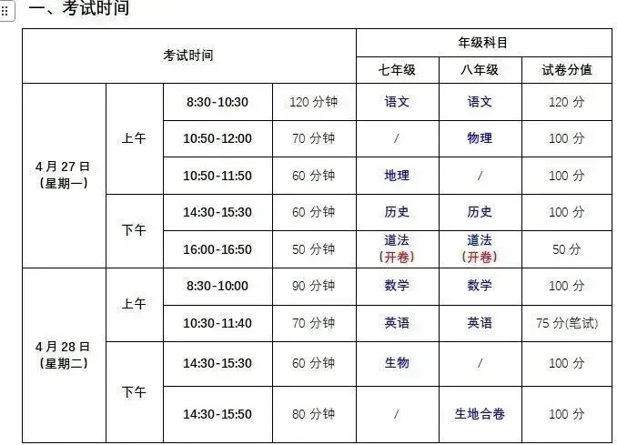 福田区初一二年级期中考试时间:4月27日-4月28日,具体科目考试时间如下所示: