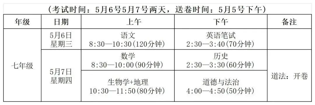罗湖区初一年级期中考试时间:5月6日-7日,具体科目考试时间如下所示: