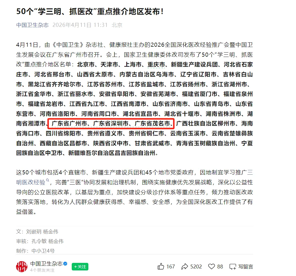 4月11日,国家卫生健康委体改司发布了50个“”学三明、抓医改”重点推介地区名单。
