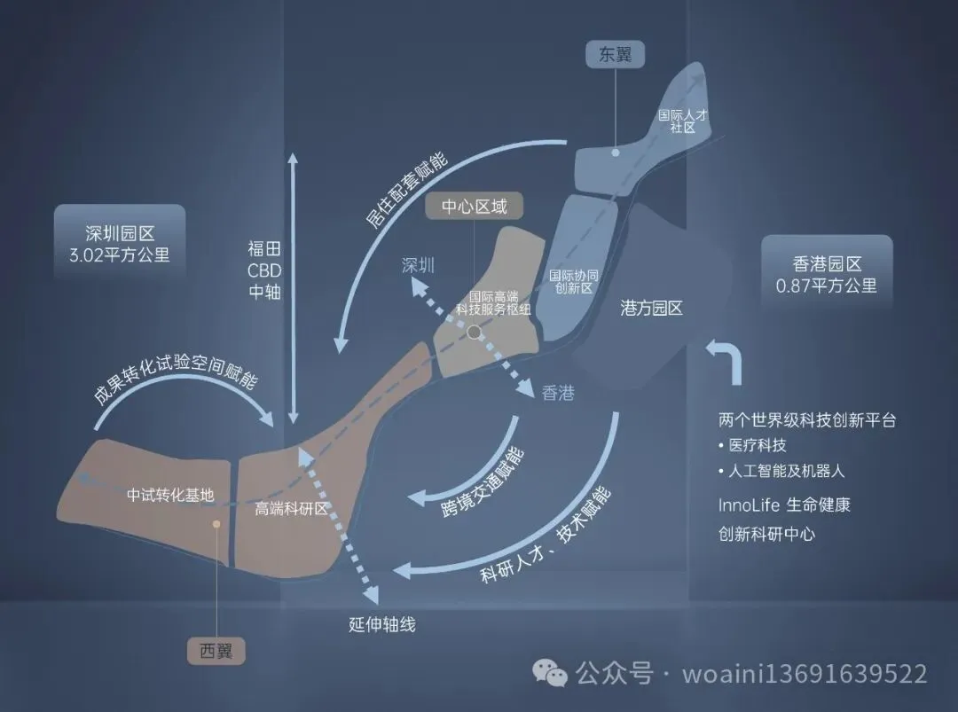 深圳园区功能分区:国际高端科技服务枢纽、高端科研区、中试转化基地、国际协同创新区、国际人才社区