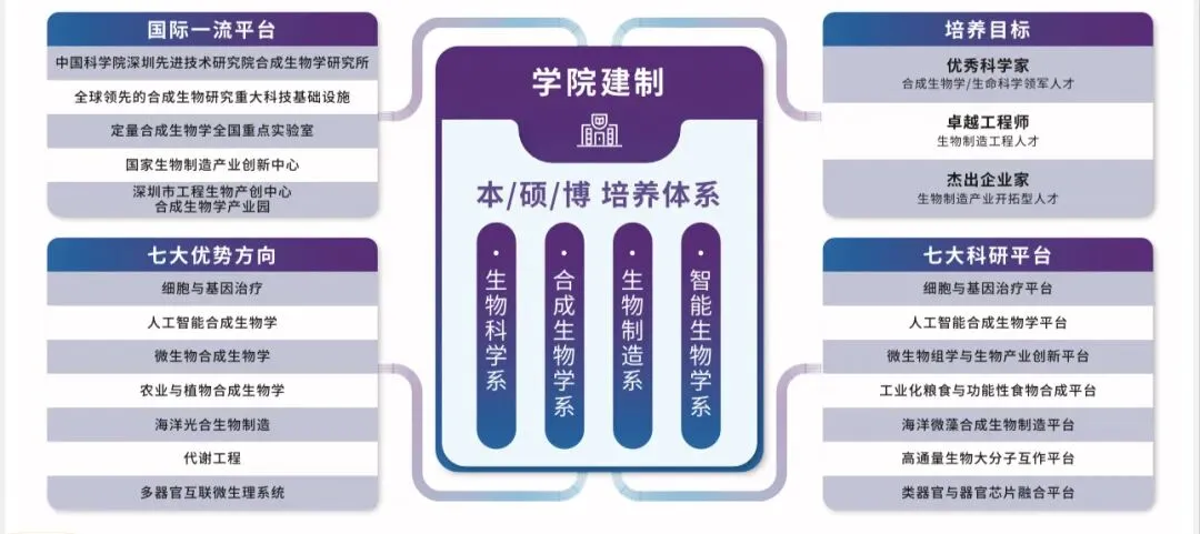 合成生物学院以深厚的生物科学和生物技术底蕴为基础,以合成生物学为特色,着力构建前沿交叉学科的教学科研创新平台,创造性地践行“科教融汇,产教融合”办学理念和“学术轨、工程轨和创业轨”育人模式,为培养具有合成生物学复合型和全球竞争力的高素质生物技术人才提供全方位支撑。学院致力于建设国际一流的合成生物学交叉学科人才培养体系,构建“课程—科研—实践—产业”全链条育人平台。本科阶段即有机会进入高水平实验室参与科研项目,并与合成生物学领域的创新企业紧密联动,实现“学—研—产”无缝衔接。