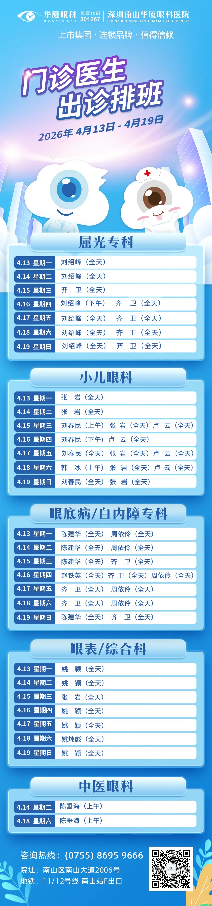 深圳南山华厦眼科医院4月13日——4月19日专家排班