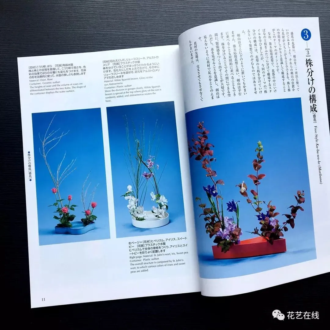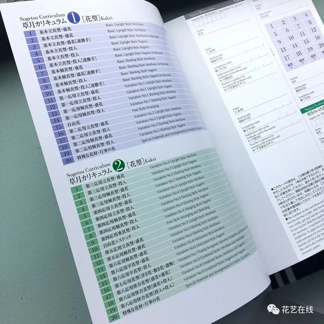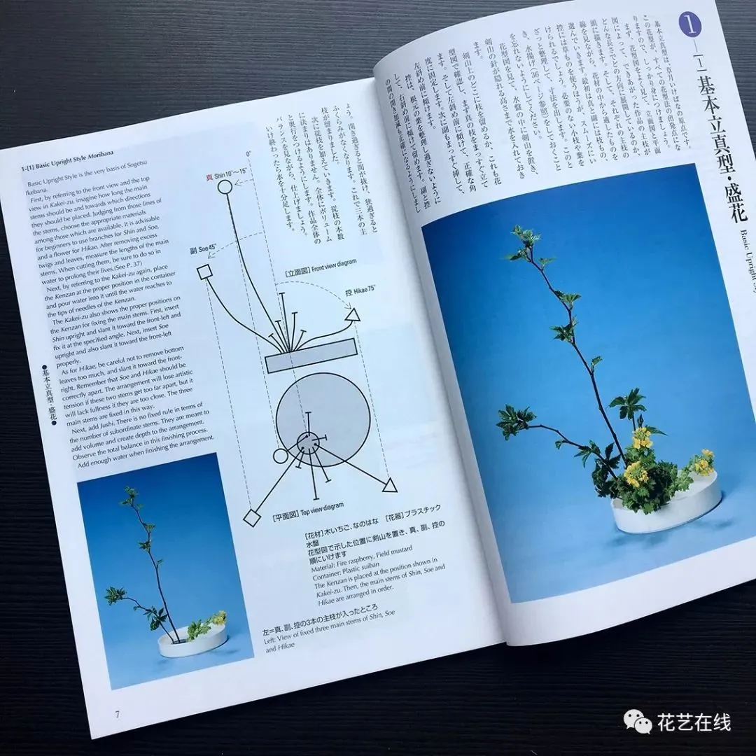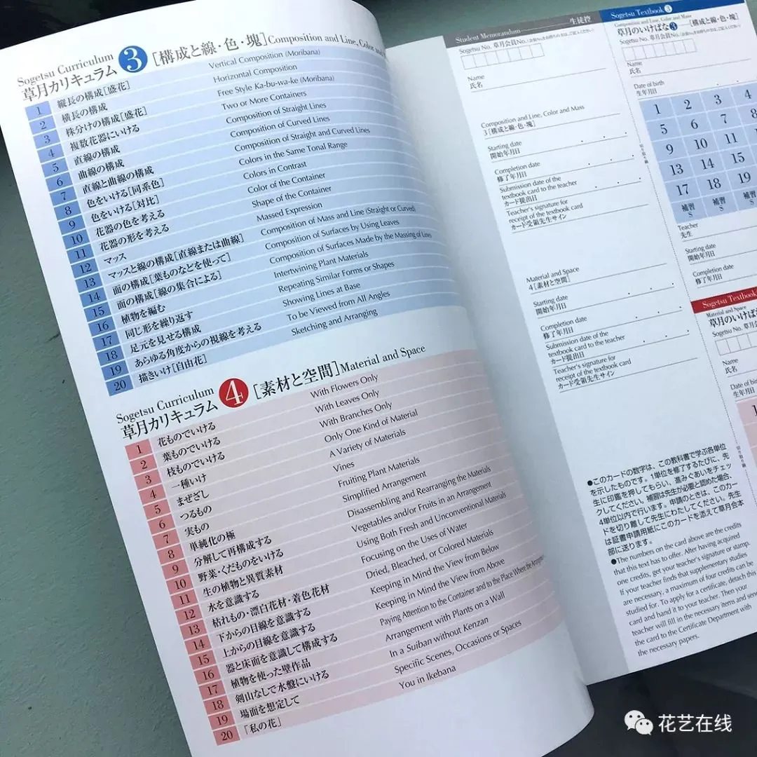 草月流基础教材1、2册是合订本,学习基本花型法及其应用,分别对应4级和3级专业资格。