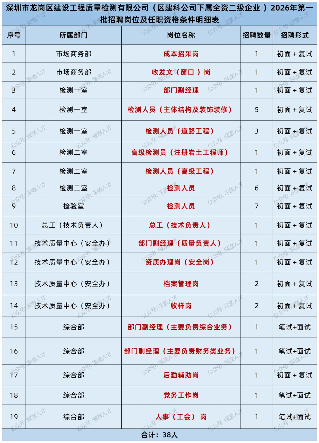 根据区建科公司战略及业务发展需要,本次拟通过社会招聘方式招聘44名专业技术人才;具体岗位设置、任职资格及岗位职责详见附件1:《深圳市龙岗区建筑科技有限公司2026年第一批招聘岗位及任职资格条件明细表》。