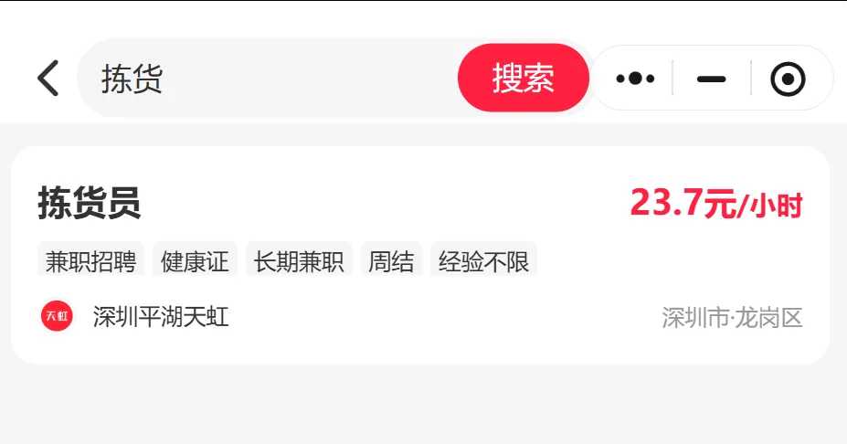 进入搜索小程序后,搜索【拣货】,即可找到天虹超市拣货员报名入口