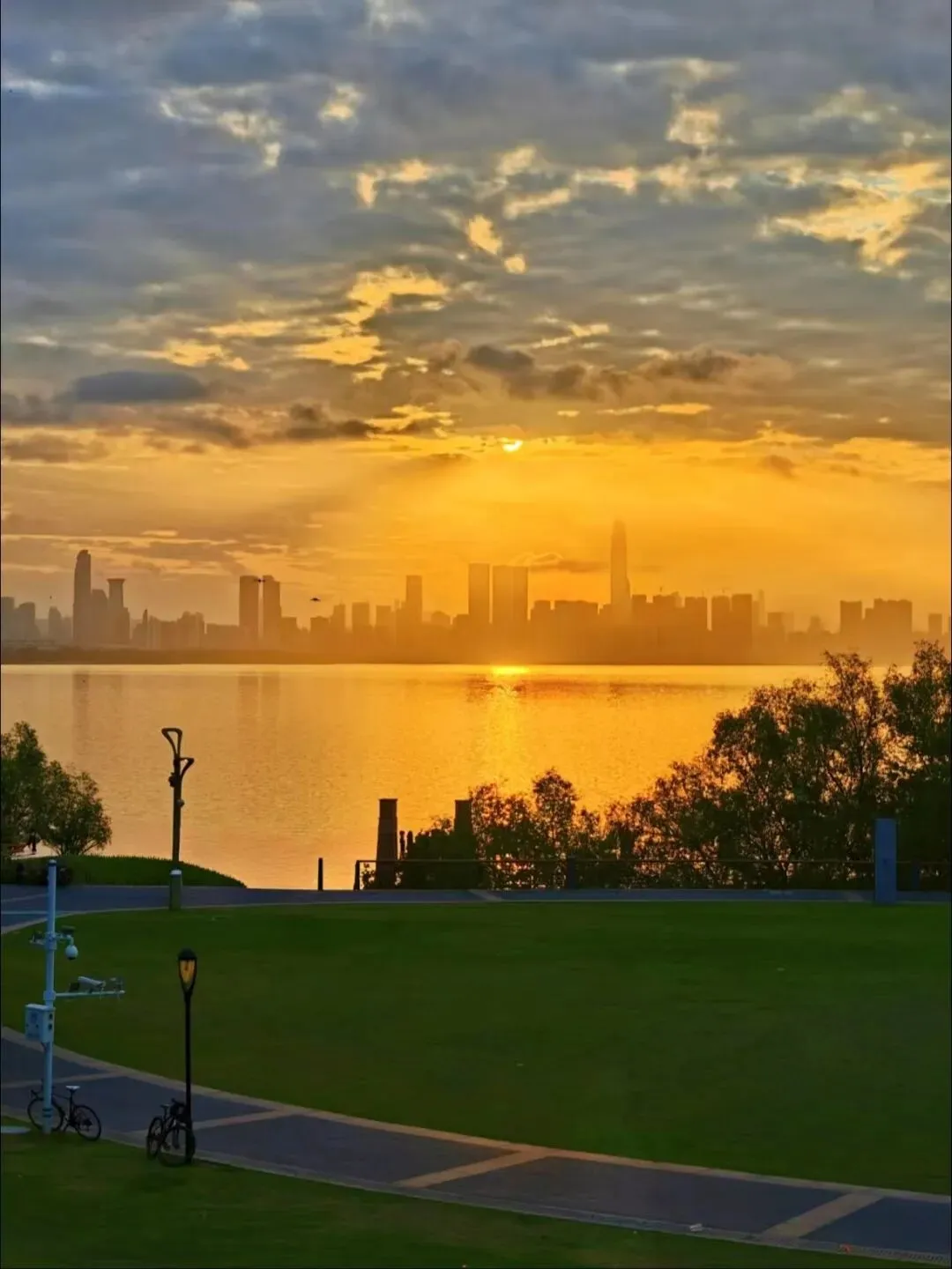 但黄色的快乐,深圳湾不会让大家失望。深圳湾公园日出剧场的落日,是这座城市最慷慨的黄色馈赠。傍晚时分,太阳缓缓沉入海面,天空从金黄烧成橘红,海面被染成碎金。坐在大草坪最前排,看一场免费的落日电影——谁说“温暖黄”只能来自花朵?大自然才是最好的调色师。