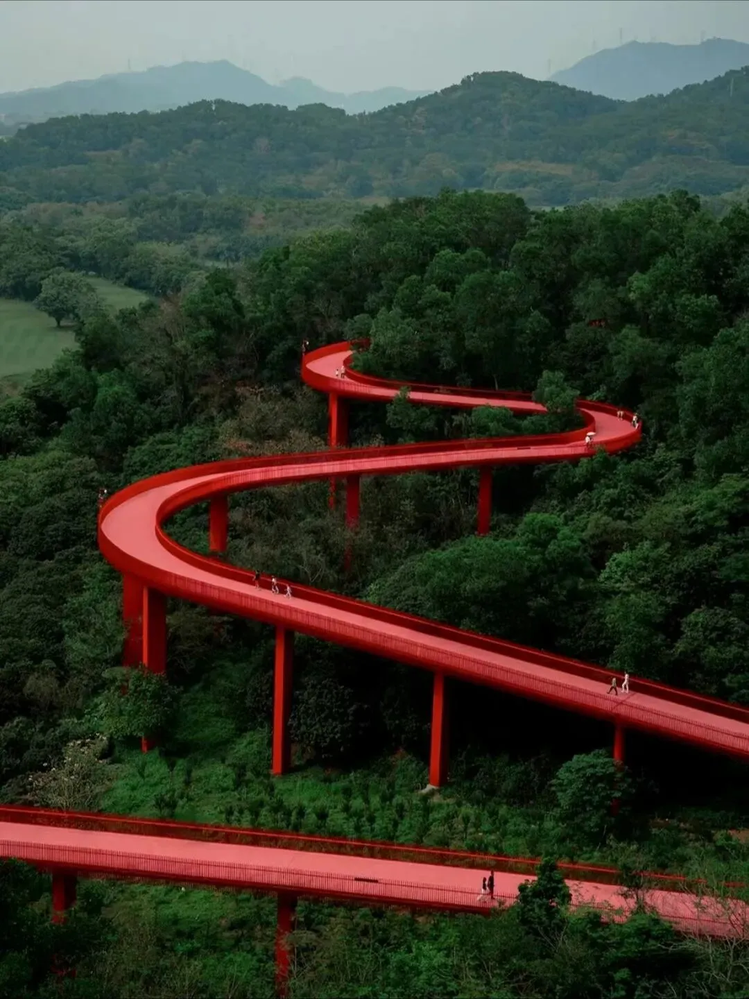深圳最出片的颜色是什么?红色。 而深圳最出片的红色在哪里?光明虹桥公园那条4公里长的红色廊桥,是公认的“大片制造机”。