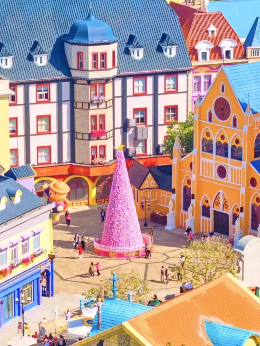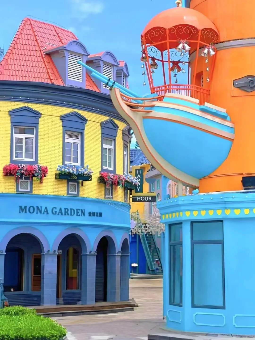 第一个是藏在世界之窗旁边的梅拉尼亚小镇。走进小镇的瞬间,你会怀疑自己是不是误入了欧洲的某个童话角落——马卡龙色的欧式小屋错落有致,橙白色的大教堂、复刻版的布拉格天文钟、彩色石板街道,整排红色、黄色、蓝色、绿色的外墙配上欧式窗户和小阳台,每一栋都精致得像明信片。最绝的是,这里免费免预约,地铁1号线世界之窗站H口出来就是,纯纯的“0元秒飞欧洲”。