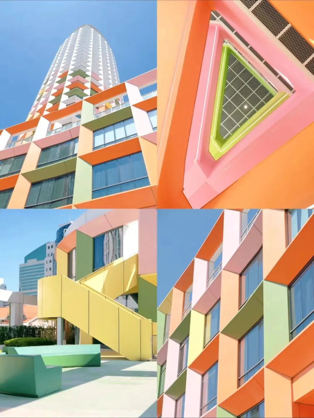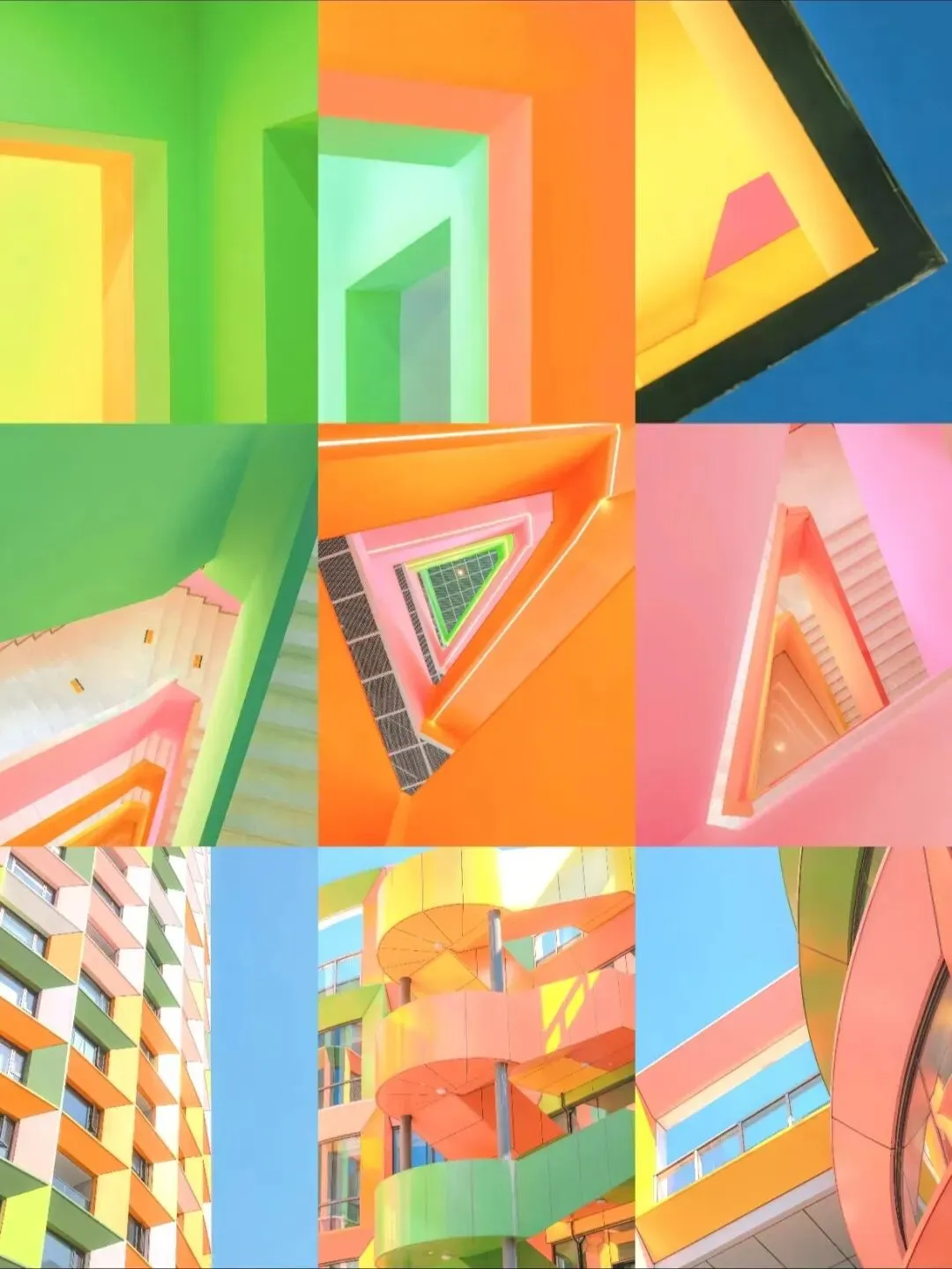 第二个是位于福田的深圳市妇儿大厦,被网友昵称为 “多巴胺大厦” 和 “万花筒” 。这栋楼从外立面到内部空间,几乎把你能想到的所有颜色都用上了——黄、橙、粉、绿的缤纷配色,连窗户、楼梯、公区的座椅、甚至地板都是彩色的。一进门的大面积色块构成的“俄罗斯方块墙”,中庭的彩色楼梯和空中连廊,随手拍都有种闯入宫崎骏动画世界的既视感。这里不仅是拍照圣地,更是亲子遛娃的天花板——儿童探索馆、图画书博物馆、妇儿剧场,孩子可以吃喝玩乐一整天。