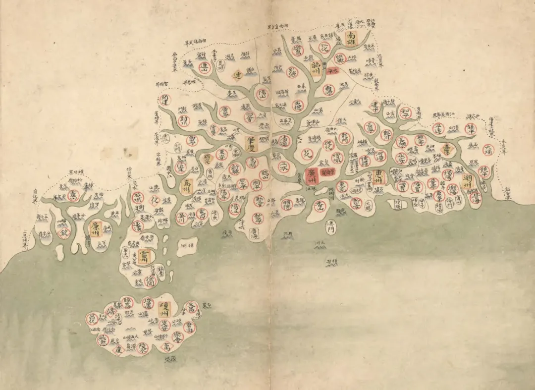 【图1】1754年广东省地图展示了珠三角水网中的新安地区。广阔的入海水湾由珠海、中山、广州、东莞、深圳以及香港和澳门的海岸线共同围合,是一个共享的海洋与社会经济生态系统。
