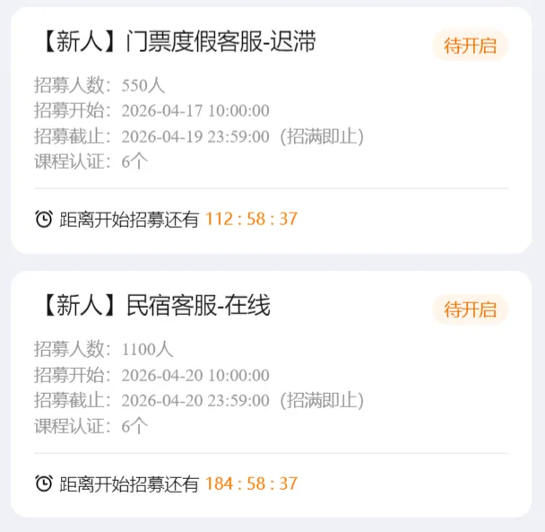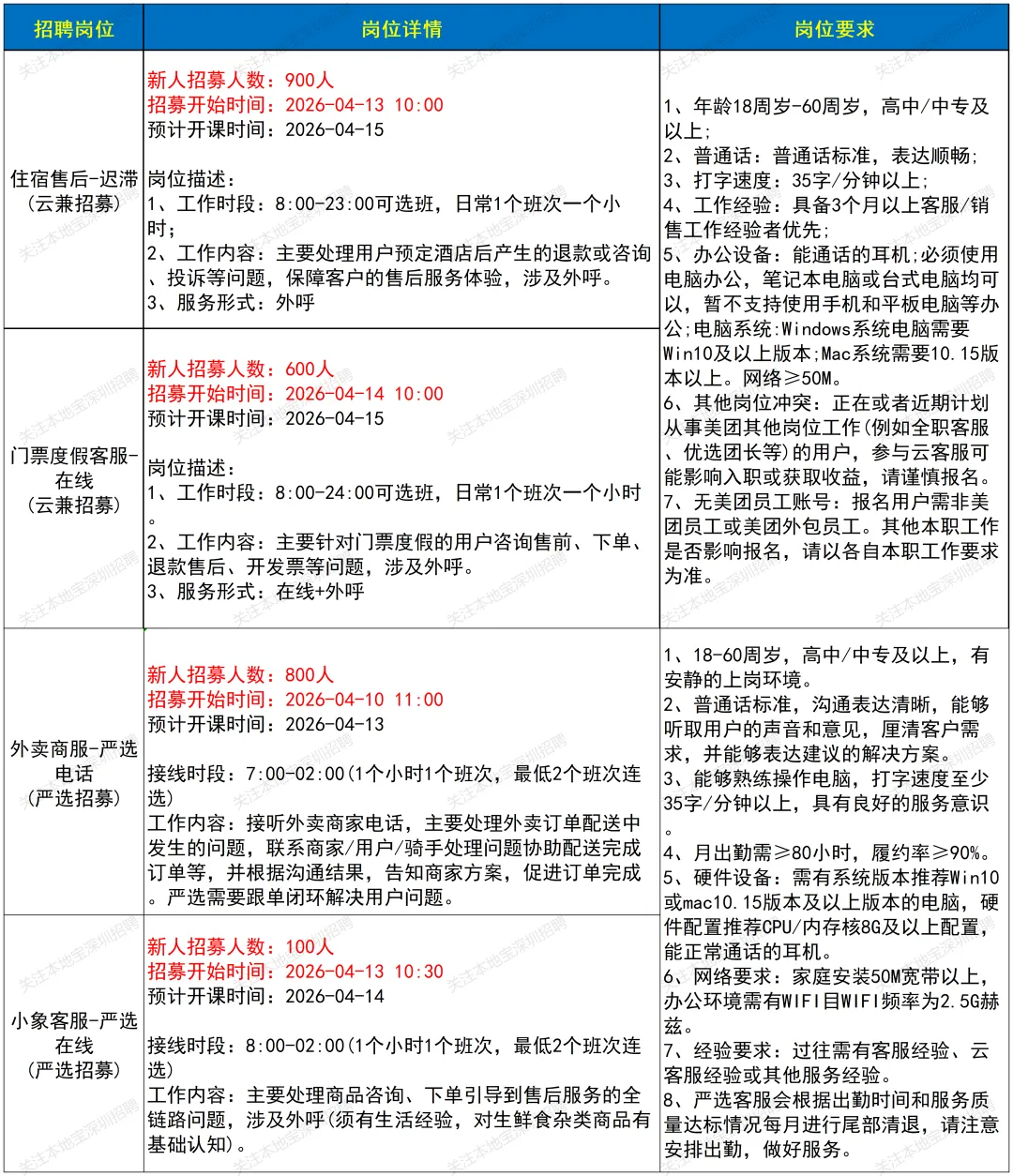 云兼招募:住宿售后-迟滞(900人)、门票度假客服-在线(600人)、住宿在线申退-外呼(1100)、门票度假客服-迟滞(550人)、民宿客服-在线(1100人),一共招4250人